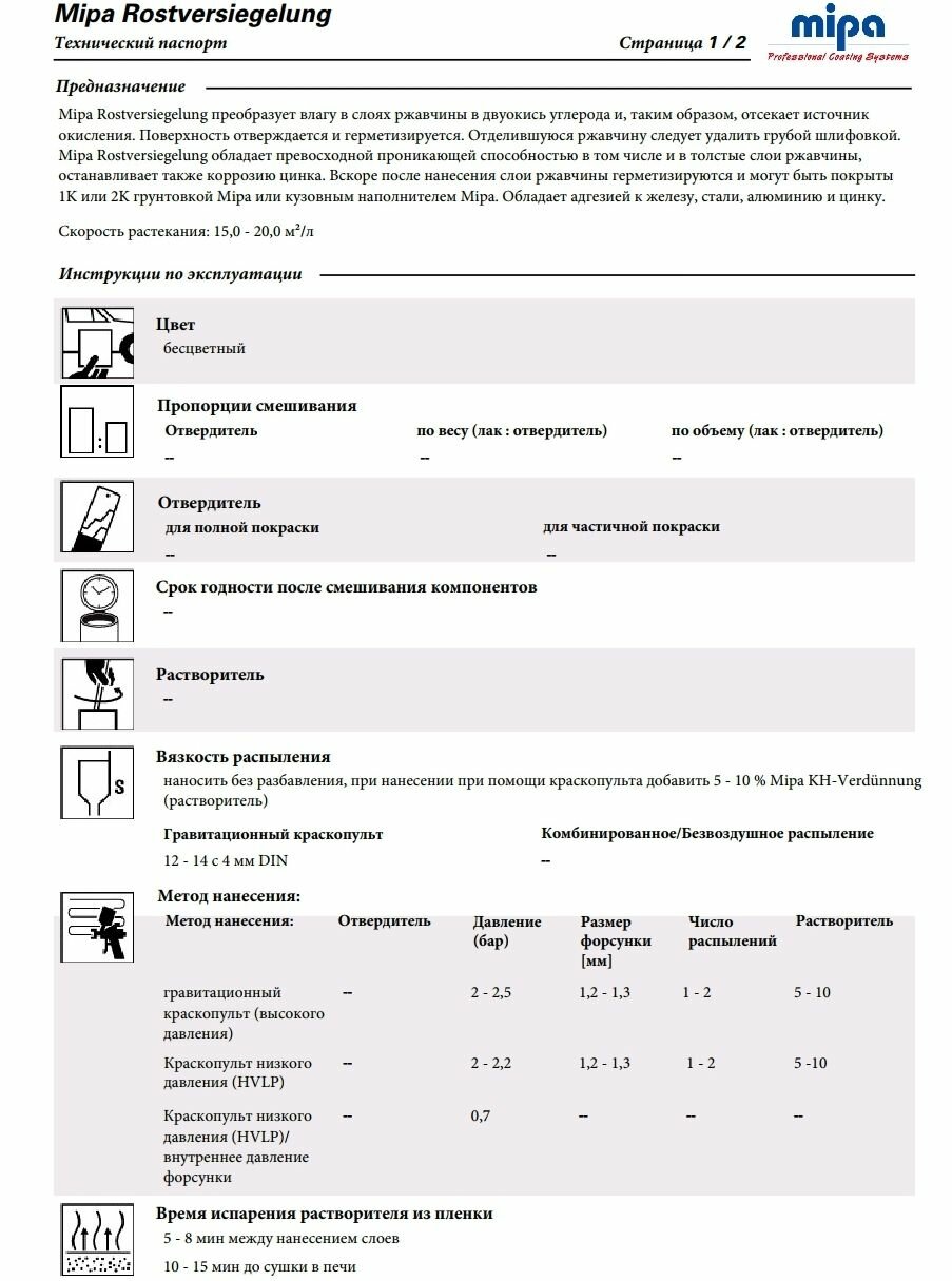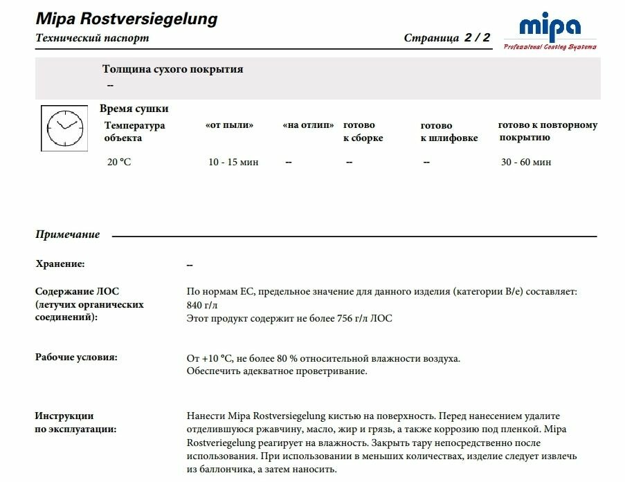 | Способ применения | Наносите Mipa Rostversiegelung при помощи кисти. Перед нанесением удалите ржавчину, масло, смазку и грязь, а также старые слои краски с коррозией. Mipa Rostversiegelung взаимодействует с влагой. Закрывайте емкость сразу после использования. Извлекайте продукт из емкости в небольших количествах, а затем наносите. |