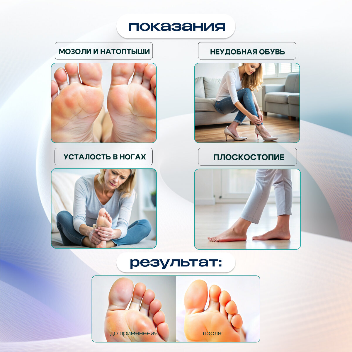 | Вид заболевания | вросший ноготь / деформация пальцев / избыточная нагрузка при ходьбе / костный нарост / мозоль / натертость / натоптыш / прижатые пальцы / продольное плоскостопие |