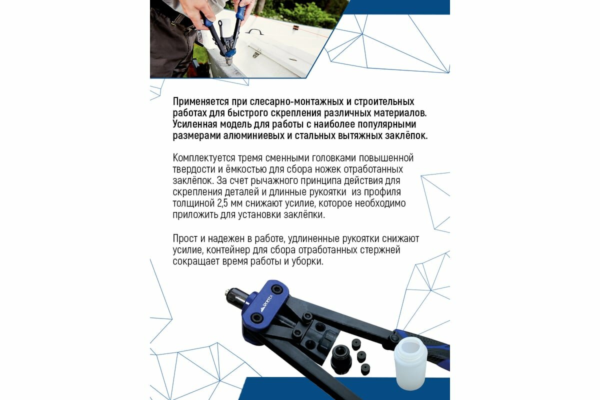 | Подробная комплектация | Заклепочник, Контейнер для сбора отработанных стержней, Три цанги - 3.2, 4.0 и 4.8 мм |