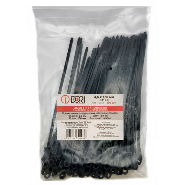 Хомут (стяжка) кабельный с монтажным отверстием (нейлон) DORI (3,6 х 150 мм, черный) 100 шт.