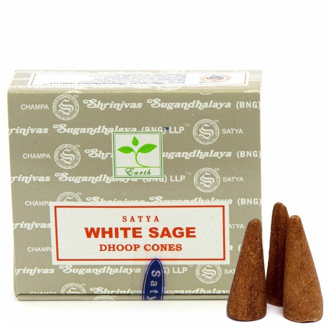 Satya Белый шалфей - 12 шт, ароматические благовония, конусовидные, конусы с подставкой, White Sage - Сатия, Сатья