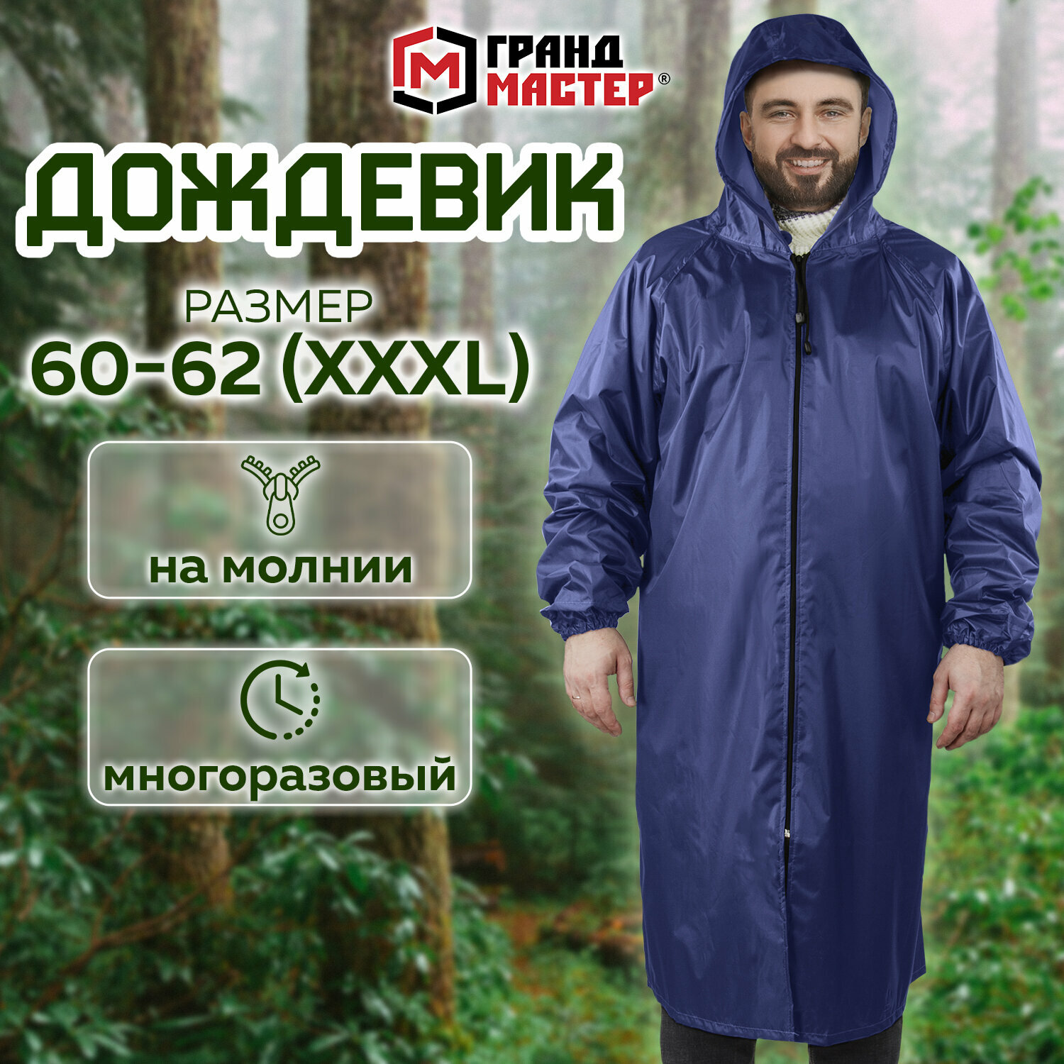 Плащ-дождевик Грандмастер синий на молнии многоразовый с ПВХ-покрытием, размер 56-58 (XXL), рост 170-176, , 610867