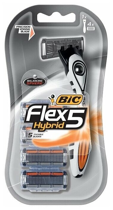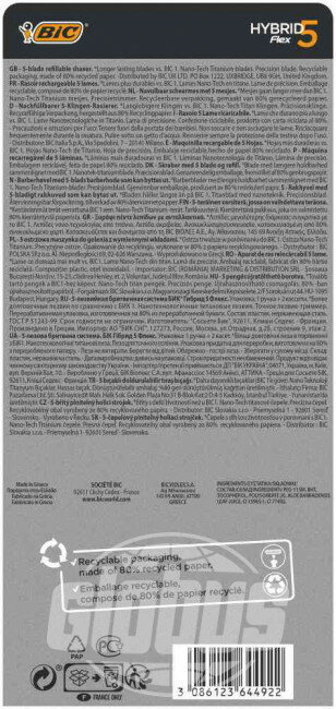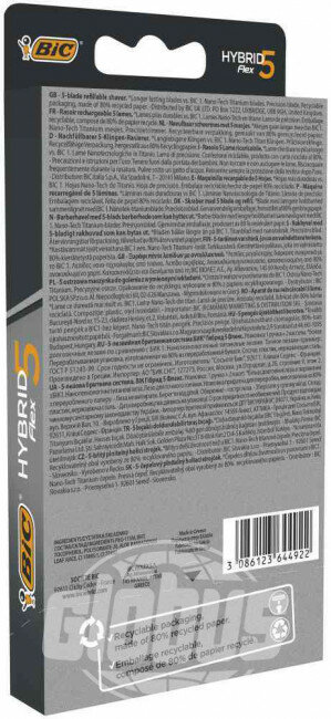 BIC Hybrid 5 Flex - это мужская бритвенная система, где 5 подвижных нанотехнологичных лезвий, индивидуально подстраиваются под контуры лица для тщательного и гладкого бритья. Каждая кассета оснащена специальной увлажняющей полоской на плавающей головке. Бритва изготовлена в Европе на заводах BIC и проходит более 25 тестов контроля качества.