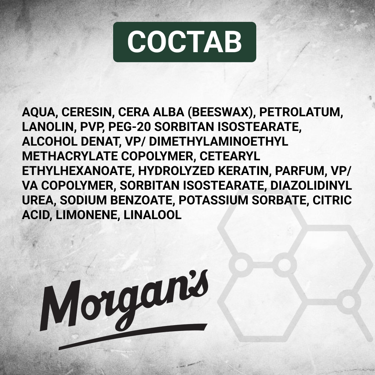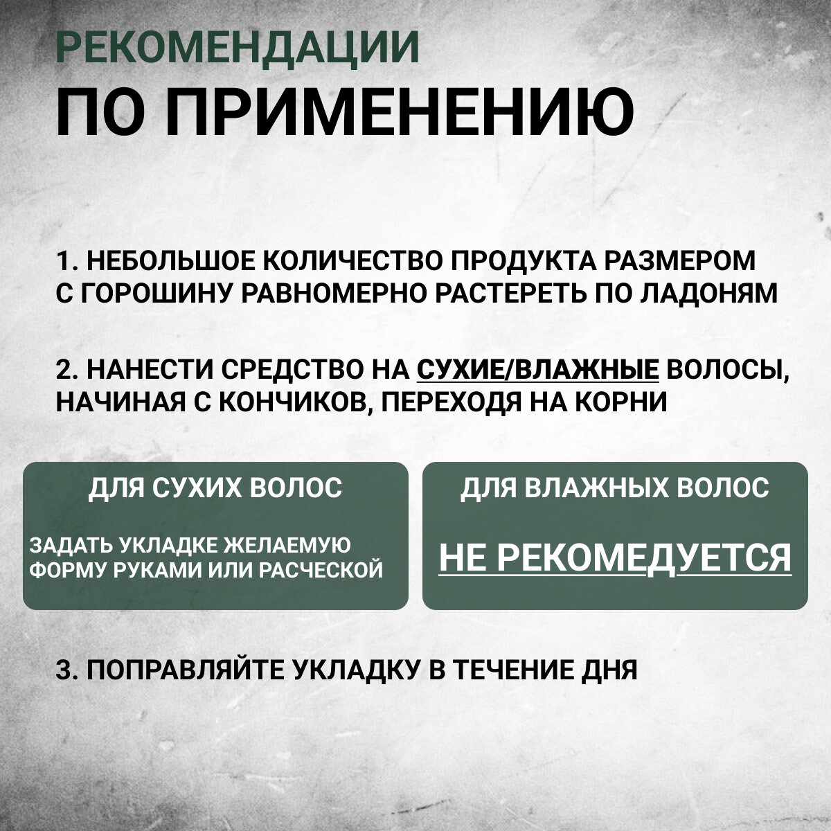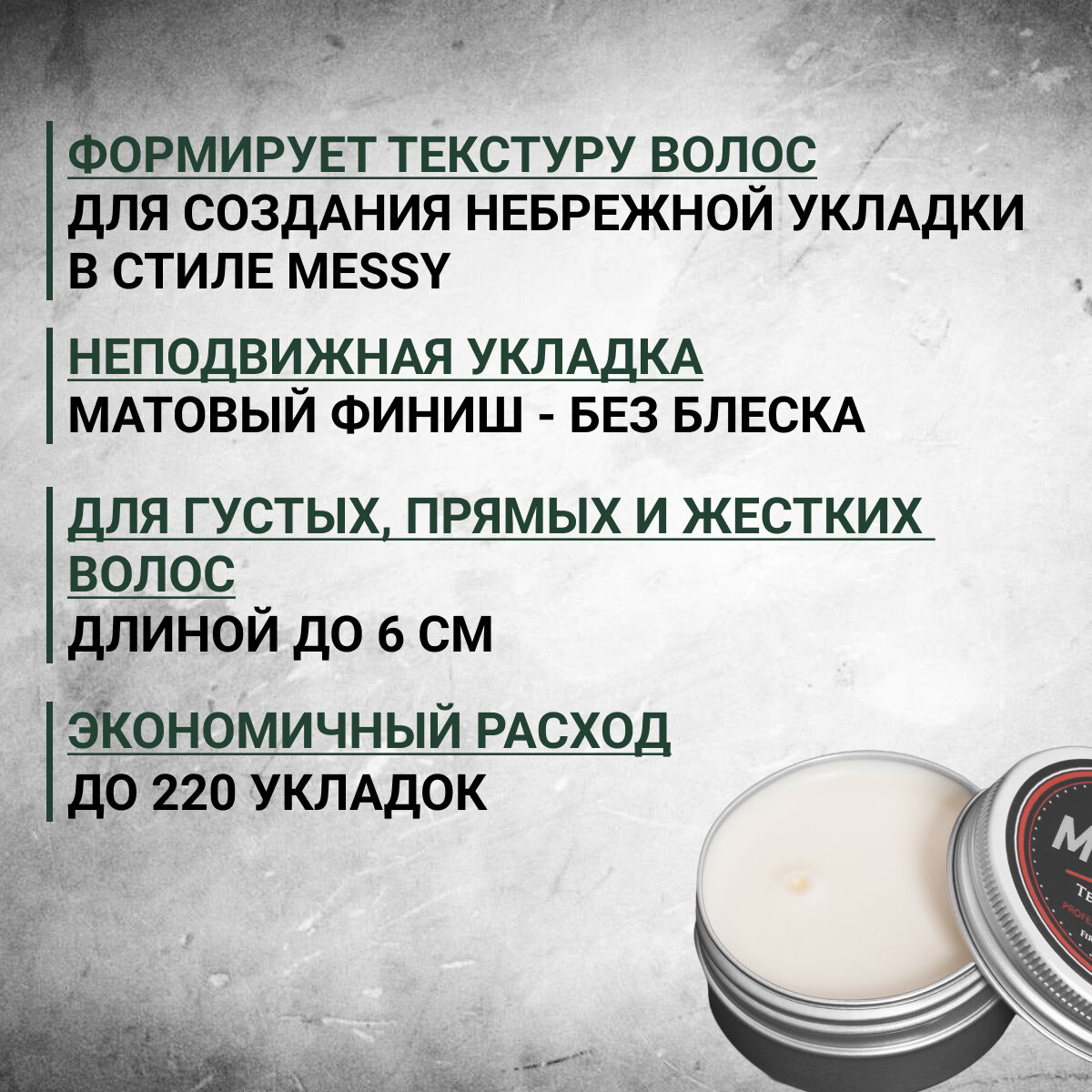 | Способ применения | возьмите небольшое количество продукта (размером с горошину). Равномерно разотрите на ладонях до теплоты. Распределите на сухих волосах. Сначала на кончики волос, затем на корни волос. Прочешите волосы расческой или задайте форму руками. Перед применением глину Morgan's Texture Clay обязательно тщательно растереть в ладонях до ощущения теплоты в руках. Это позволит глине хорошо растаять и равномерно наноситься на волосы. В противном случае глина может комкаться в ладонях |