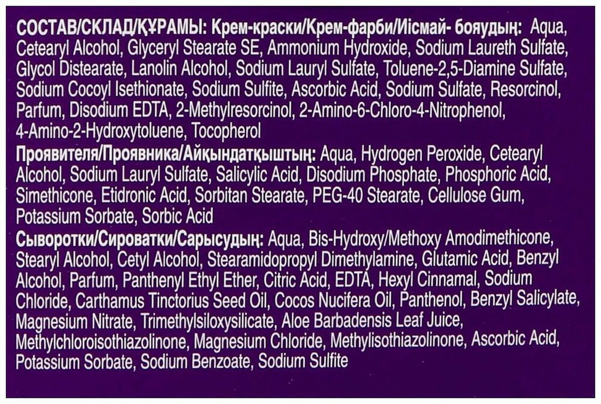 | Способ применения | 1) Приготовьте смесь для окрашивания 2) Нанесите крем-краску только на сухие волосы для получения интенсивного результата, затем смойте по окончании времени воздействия водой 3)Нанесите сыворотку Интенсивный блеск на влажные волосы. Более подробную инструкцию смотрите внутри упаковки. |