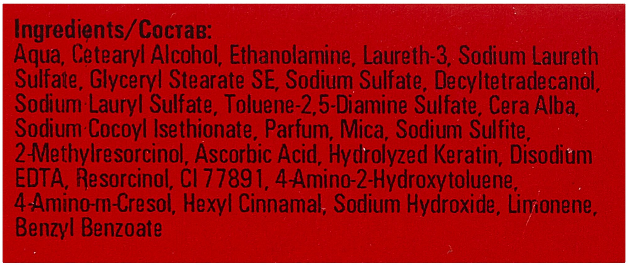 | Состав | aqua, cetearyl alcohol, ethanolamine, laureth-3, sodium laureth sulfate, toluene-2,5 diamine sulfate, glyceryl stearate se, sodium sulfate, decyltetradecanol, sodium lauryl sulfate, cera alba, parfum, sodium cocoyl isethionate, mica, hydroxyethyl-3,4-methylenedioxyaniline hci, resorcinol, sodium sulfate, m-aminophenol, ascorbic acid, hydrolyzed keratin, disidium edta, 2-methylresorcinol, ci 77891, hexyl cinnamal, limonene, benzyl benzoate |