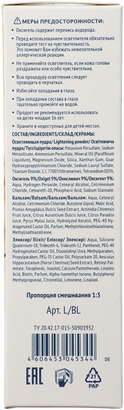 | Способ применения | приготовление смеси: смешайте содержимое двух пакетиков с осветляющей пудрой, добавьте оксигель из саше, добавьте ампулу эликсира и тщательно все перемешайте; Первое применение: быстро и равномерно нанесите осветлитель на сухие волосы, начиная от корней волос, стараясь избегать контакта с кожей; Нанесение на отросшие корни: нанесите осветлитель только на отросшие участки волос, разделяя их на пробор, стараясь избегать контакта с кожей головы. Не наносите смесь на ранее осветленные волосы; Максимальное время воздействия 30 минут; По истечении времени окрашивания тщательно промойте волосы большим количеством теплой воды, пока она не станет прозрачной. Рекомендуется после окрашивания вымыть волосы мягким шампунем |
