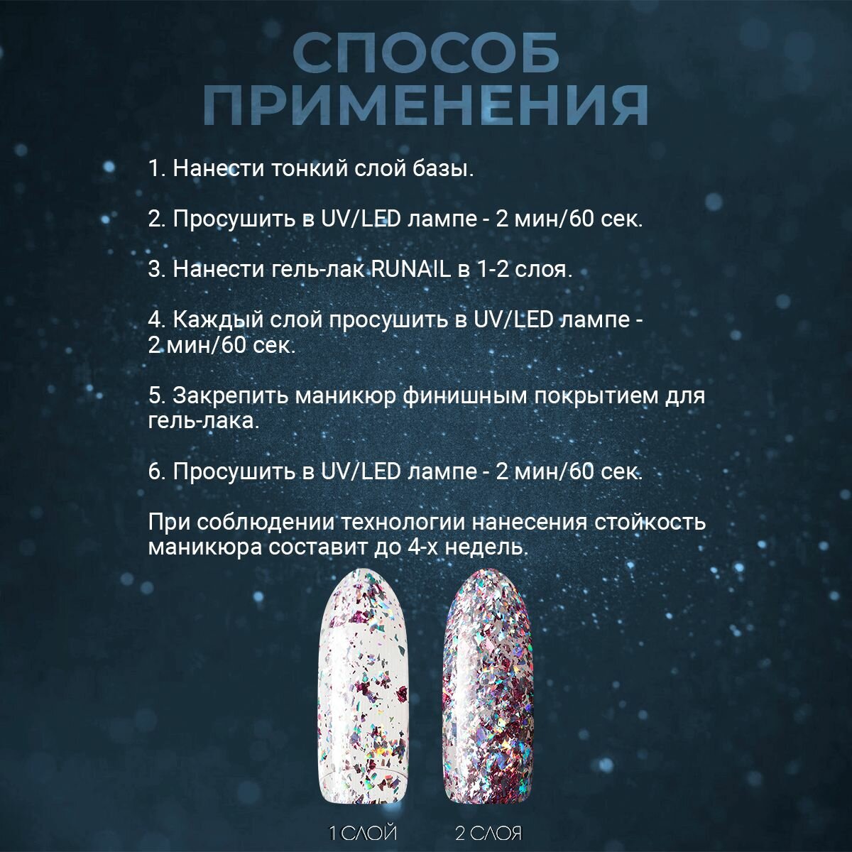 | Способ применения | Подготовка ногтевой пластины (НП): 1. Снять природный глянец с натурального ногтя при помощи бафа или пилки для натуральных ногтей. 2. Выполнить гигиенический маникюр любым привычным способом (аппаратный, обрезной, комбинированный). 3. Нанести на НП дегидратор, подсушить на воздухе 60 сек. 4. Полусухой кистью нанести праймер на НП, подсушить на воздухе 2-3 мин. Базовое покрытие: 1. Нанести первый тонкий слой базы втирающими движениями. 2. Просушить в UV/LED лампе - 60 сек. 3. Выполнить выравнивание или смоделировать архитектуру ногтя. 4. Просушить в UV/L ED лампе - от 60 сек. Нанесение цветного покрытия гель-лаком пошагово: 1. Нанести гель-лак runail GEL POLISH в 1-2 слоя. 2. Каждый слой просушить в UV/LED лампе - 60 сек. Финишное покрытие: 1. Закрепить маникюр финишным покрытием для гель-лака. 2. Просушить в UV/LED лампе - 60 сек. При соблюдении технологии нанесения стойкость маникюра составит до 4-х недель. |