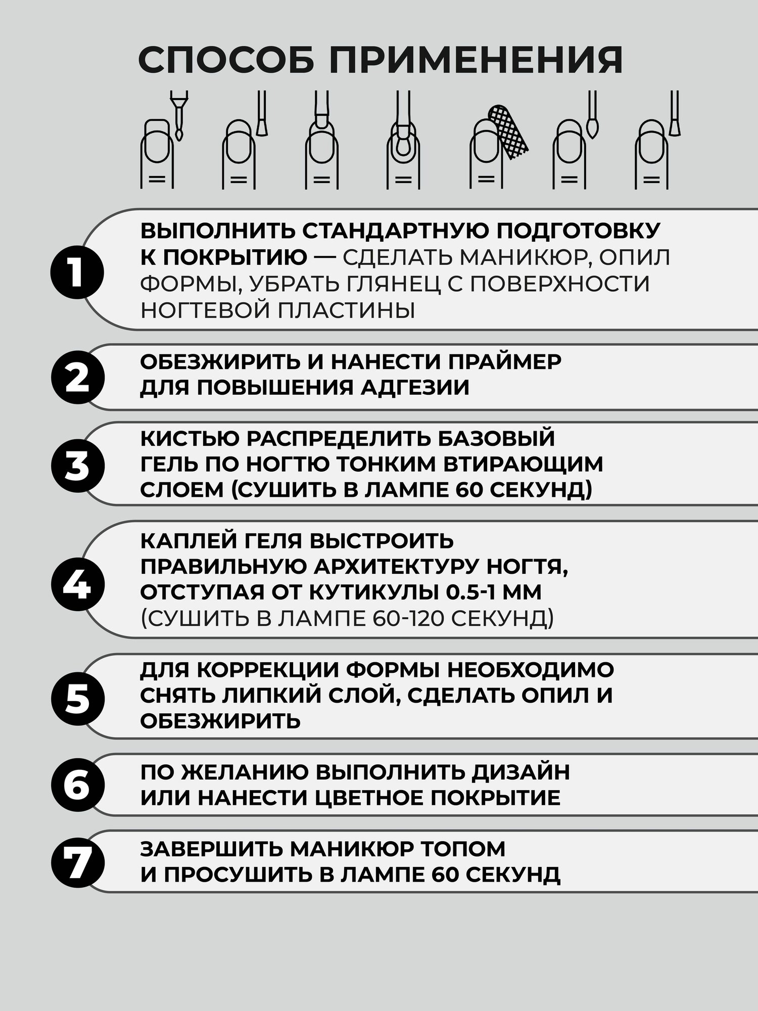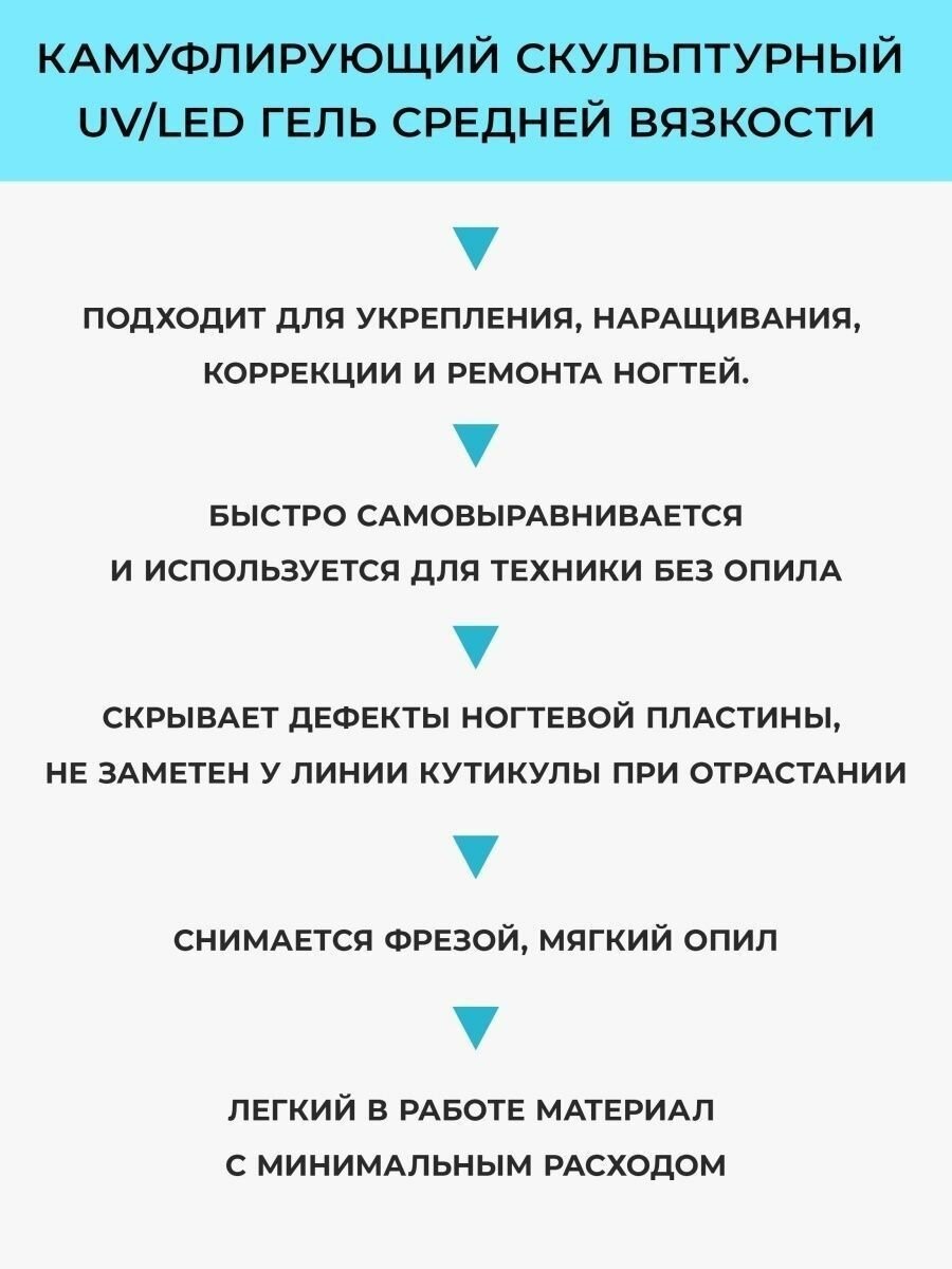 | Способ применения | База: нанести на подготовленный ноготь тонким слоем втирающими движениями. Сушить 30-60 секунд. Моделирование: выкладывать мягкими движениями, не давить на кисть, по технике выравнивания гель-лаком. При необходимости перевернуть палец и дать гелю распределиться. Сушить 60-90 секунд. При работе в технике без опила рекомендуется после полимеризации скульптуры подпилить торцы, открыв немного толщины. Финиш: наносить тонким слоем мягкой кистью. Сушить не меньше двух минут. Дать гелю остыть, затем снимать дисперсию. Для получения более интенсивного глянца рекомендуется перекрывать гель топом. |