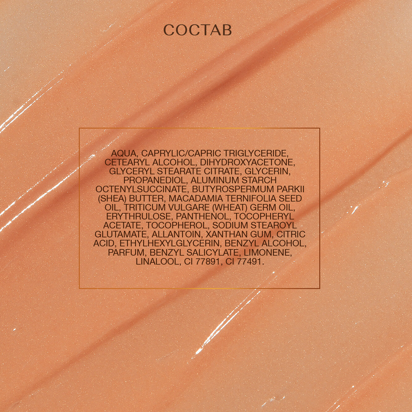 | Состав | DIHYDROXYACETONE, GLYCERYL STEARATE CITRATE, GLYCERIN, PROPANEDIOL, ALUMINUM STARCH OCTENYLSUCCINATE, BUTYROSPERMUM PARKII (SHEA) BUTTER, MACADAMIA TERNIFOLIA SEED OIL, TRITICUM VULGARE (WHEAT) GERM OIL, ERYTHRULOSE, PANTHENOL, TOCOPHERYL ACETATE, TOCOPHEROL, SODIUM STEAROYL GLUTAMATE, ALLANTOIN, XANTHAN GUM, CITRIC ACID, ETHYLHEXYLGLYCERIN, BENZYL ALCOHOL, PARFUM, BENZYL SALICYLATE, LIMONENE, LINALOOL, CI 77891, CI 77491. |