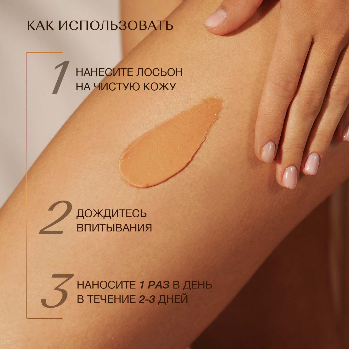 | Способ применения | Легкими массирующими движениями нанесите лосьон на предварительно очищенную кожу до полного впитывания. Наносите продукт 1 раз в день в течение 2-3 дней до получения желаемого эффекта. Помойте руки после нанесения. Внимание: возможна индивидуальная непереносимость натуральных компонентов. В случае попадания средства в глаза тщательно промойте их водой. Хранить при температуре 5 °C - 25 °C. Срок годности - 24 месяца. |
