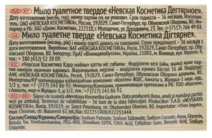 | Состав | sodium Tallowate, Sodium Palm Kernelate, Water, Glycerin, Sodium Сhloride, Betula Tar, Sodium Acrylates Copolymer, Sodium Benzoate, Sodium Citrate, Disodium EDTA, Diethylenetriamine penta (methylene phosphonic acid) Heptasodium Salt |