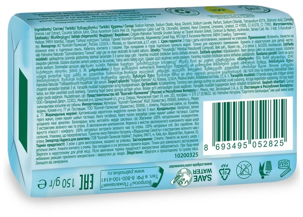 Ниже Вы можете прочитать отзывы на Palmolive Мыло Бодрящая свежесть с экстрактом зеленого чая и огурца 150 г 1 шт, ознакомится с подробными характеристиками, посмотреть интересные обзоры и фотографии на Palmolive Мыло Бодрящая свежесть с экстрактом зеленого чая и огурца 150 г 1 шт.