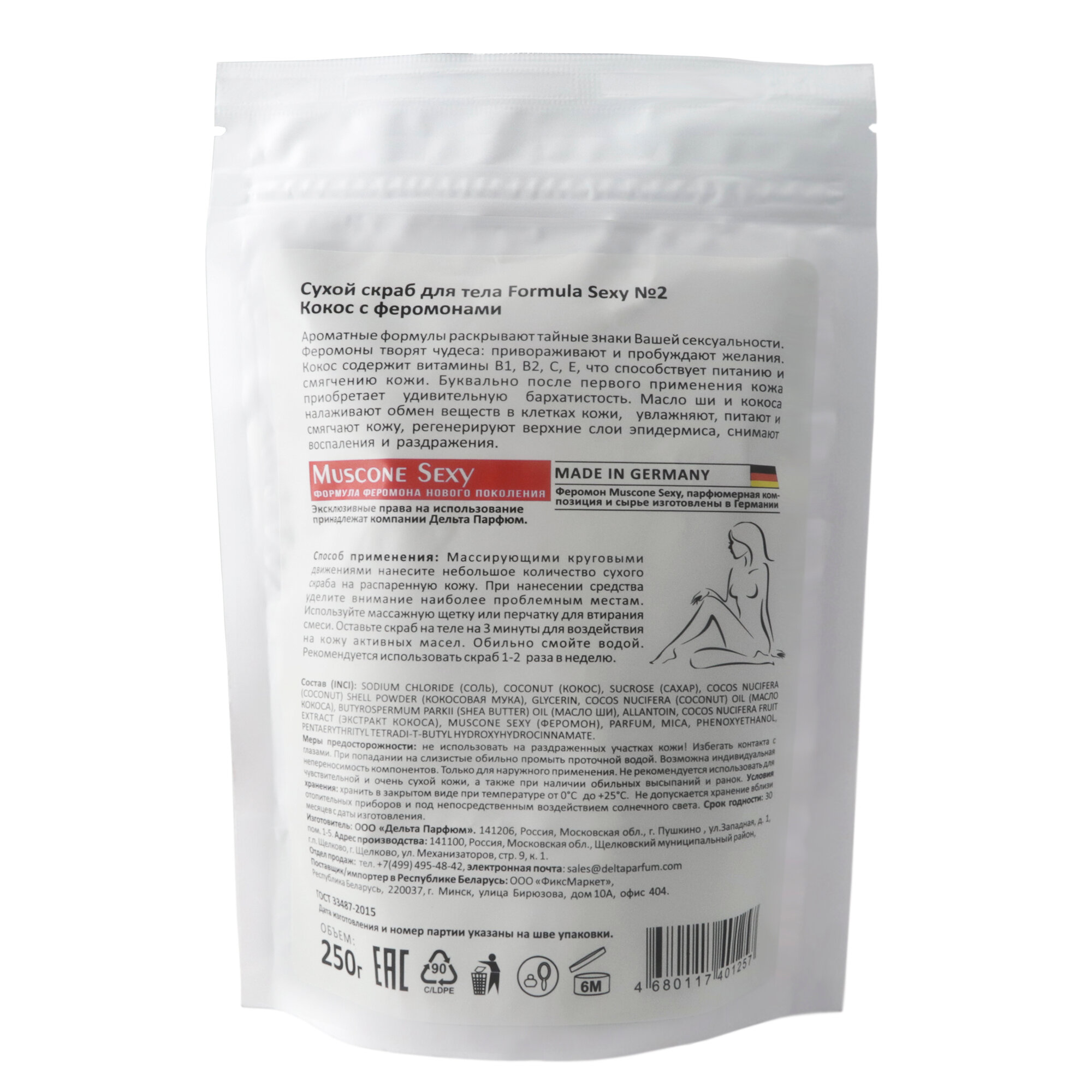 | Состав | SODIUM CHLORIDE (СОЛЬ), COCONUT (КОКОС), SUCROSE (САХАР), Cocos nucifera (coconut) shell powder (КОКОСОВАЯ МУКА), GLYCERIN, COCOS NUCIFERA (COCONUT) OIL (МАСЛО КОКОСА), BUTYROSPERMUM PARKII (SHEA BUTTER) OIL (МАСЛО ШИ), ALLANTOIN, COCOS NUCIFERA FRUIT EXTRACT (ЭКСТРАКТ КОКОСА), MUSCONE SEXY (ФЕРОМОН), PARFUM, MICA, PHENOXYETHANOL, Pentaerythrityl Tetra-di-t-butyl Hydroxyhydrocinnamate. |