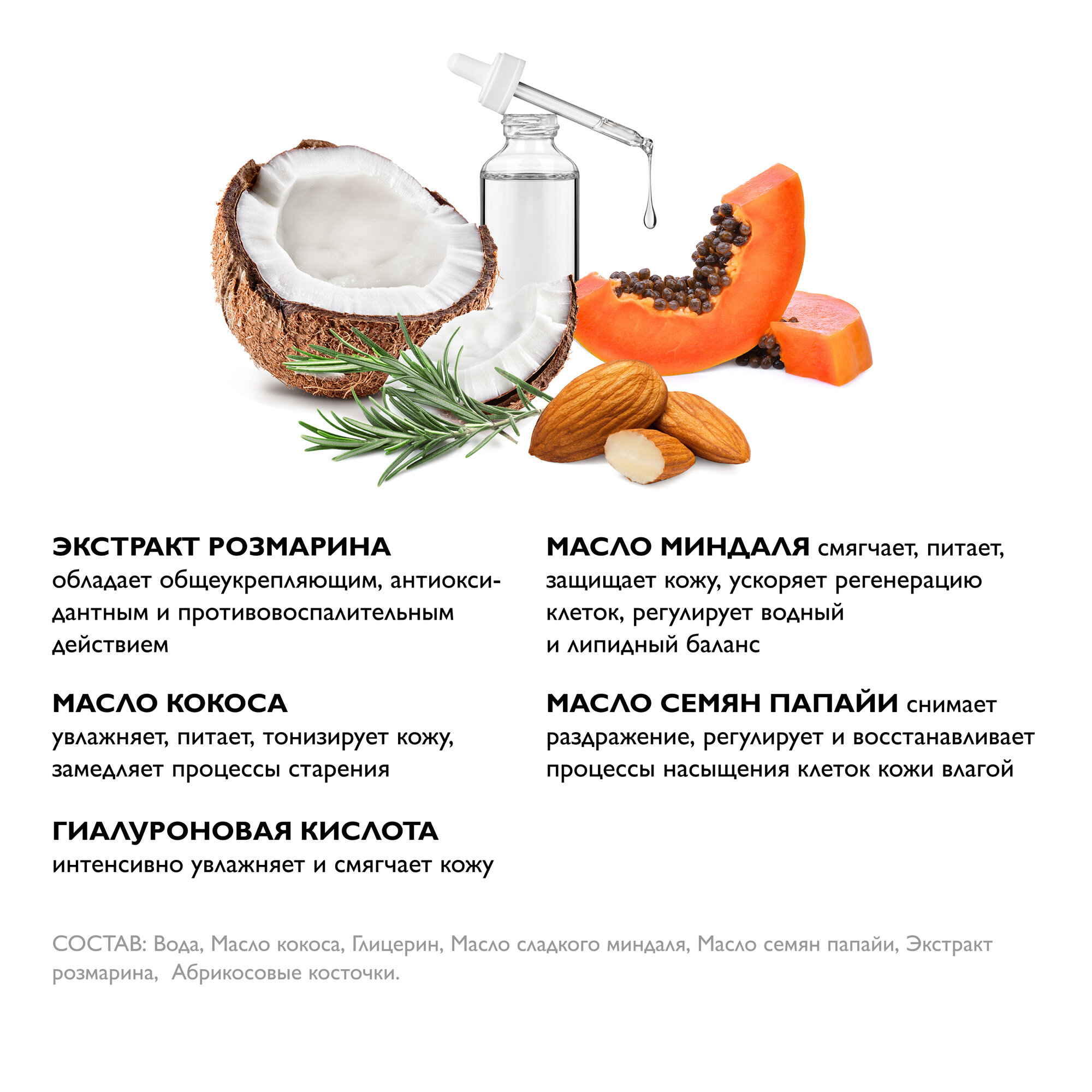 | Масла и экстракты | кокосовое масло / масло розмарина / миндальное масло |