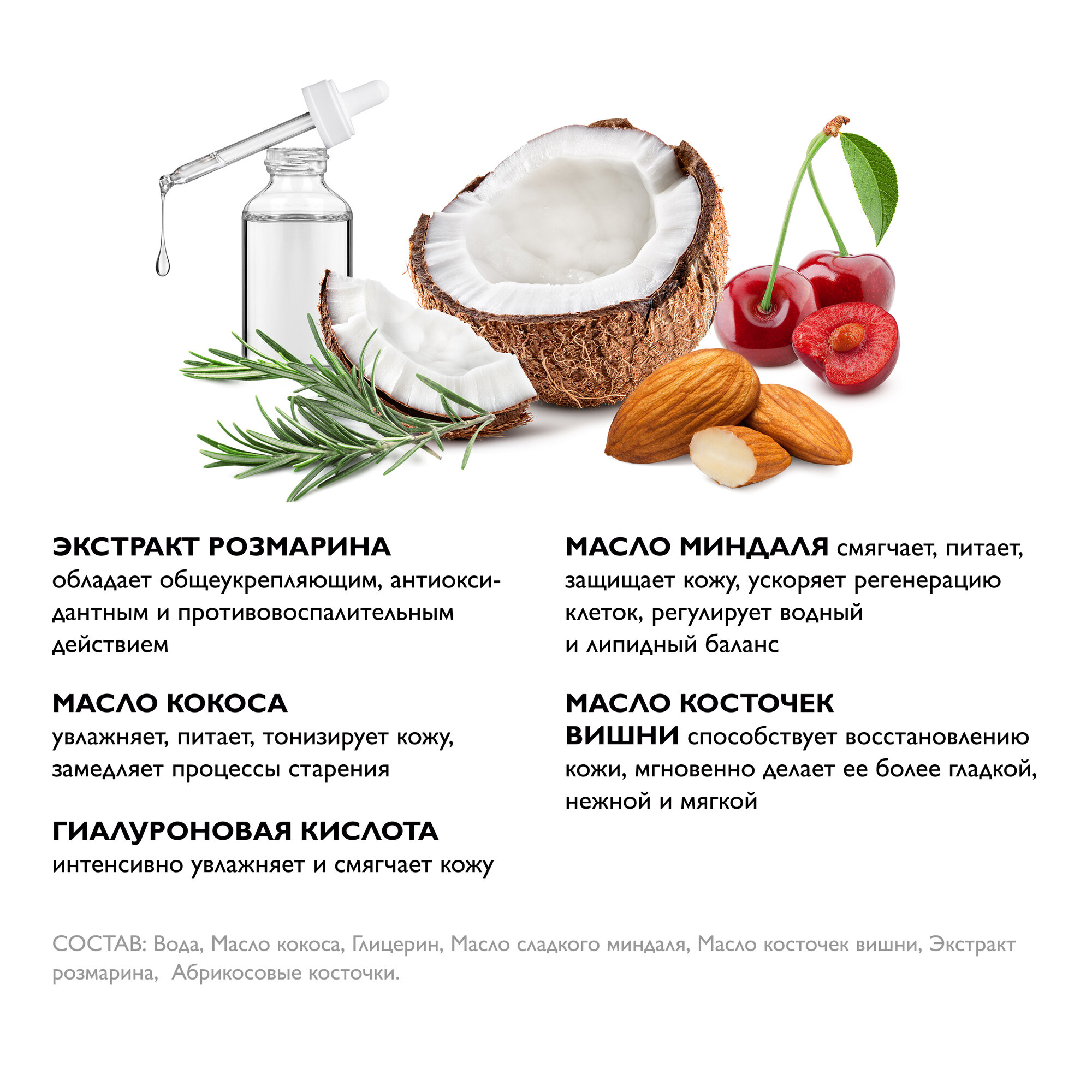 | Масла и экстракты | кокосовое масло / масло розмарина / миндальное масло |