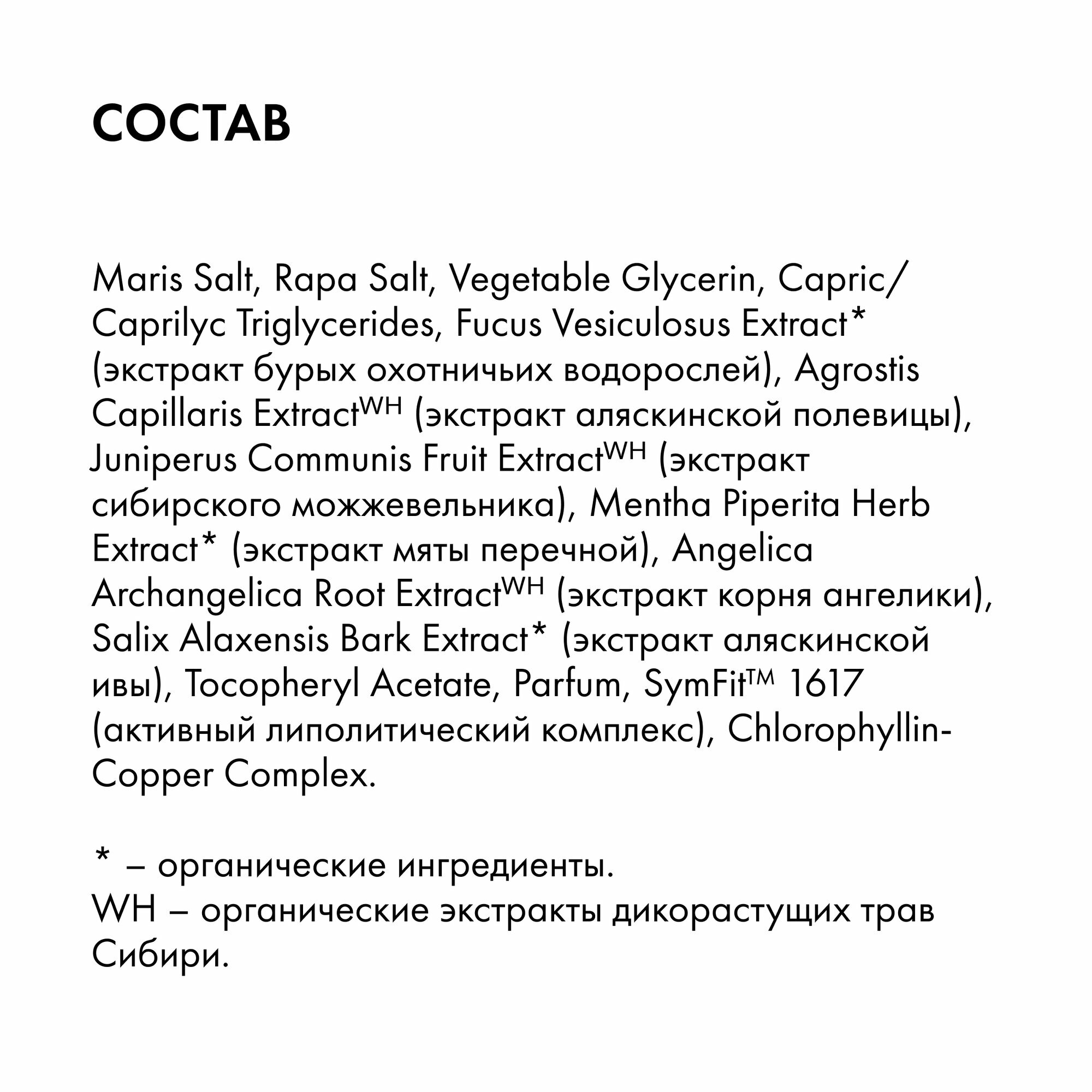 | Состав | Maris Salt, Rapa Salt, Vegetable Glycerin, Capric/Caprilyc Triglycerides, Fucus Vesiculosus Extract* (экстракт бурых охотничьих водорослей), Agrostis Capillaris Extractᵂᴴ (экстракт аляскинской полевицы), Juniperus Communis Fruit Extractᵂᴴ (экстракт сибирского можжевельника), Mentha Piperita Herb Extract*(экстракт мяты перечной), Angelica Archangelica Root Extractᵂᴴ (экстракт корня ангелики), Salix Alaxensis Bark Extract* (экстракт аляскинской ивы), Tocopheryl Acetate, Parfum, SymFit™ 1617 (активный липолитический комплекс), Chlorophyllin-Copper Complex.*– органические ингредиенты, ᵂᴴ – органические экстракты дикорастущих трав Сибири. |
