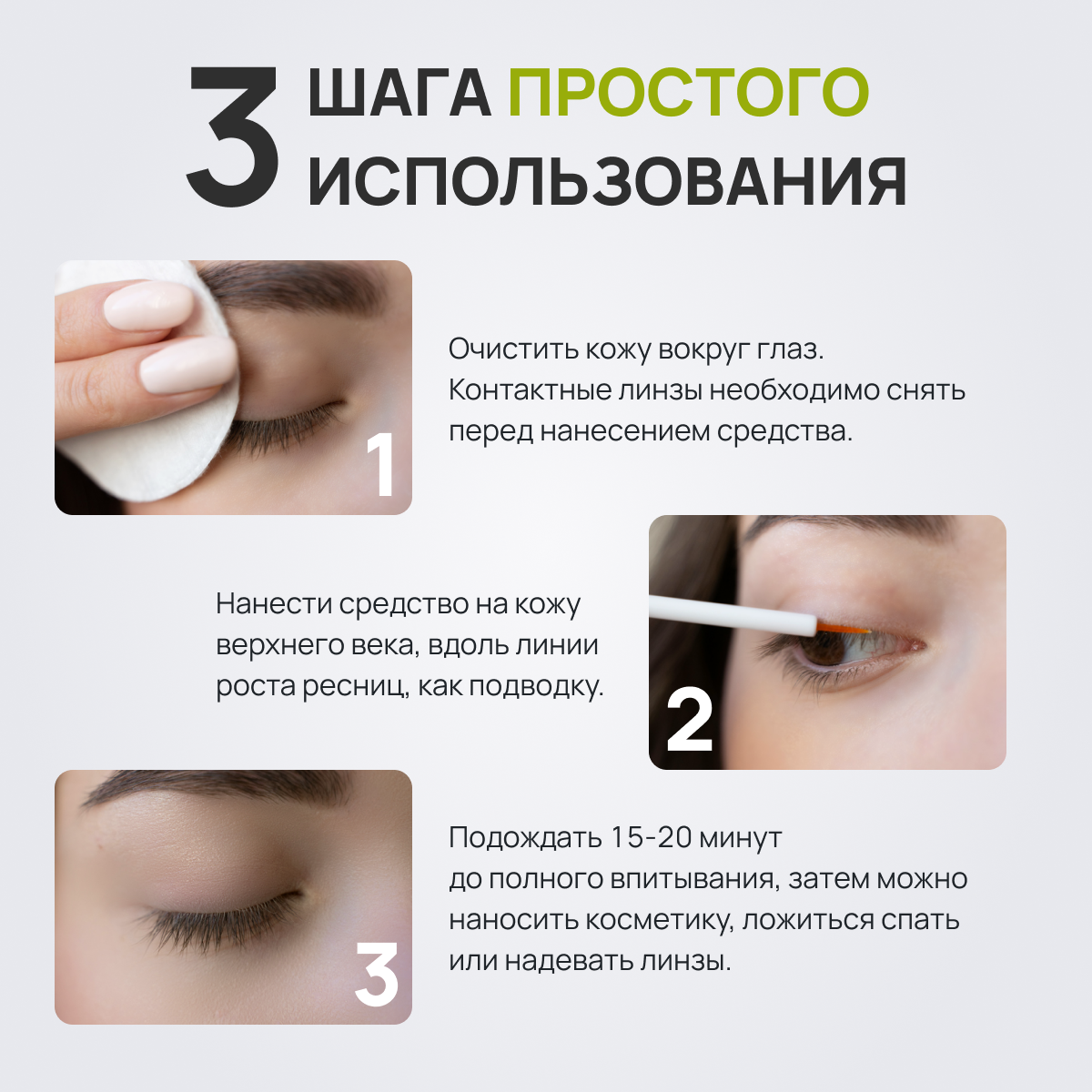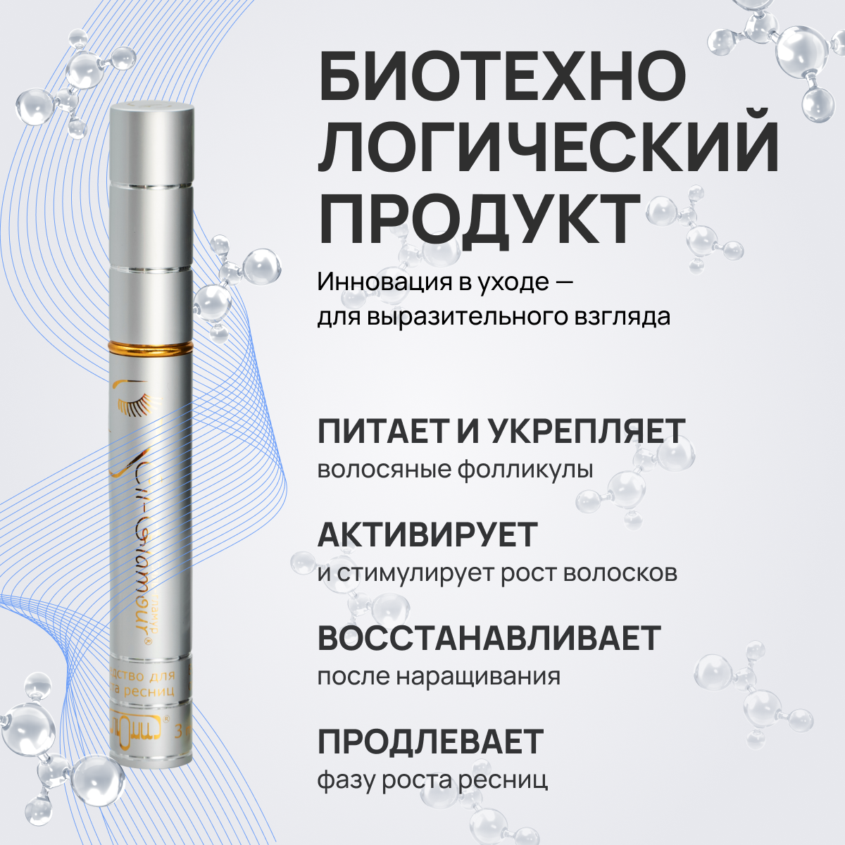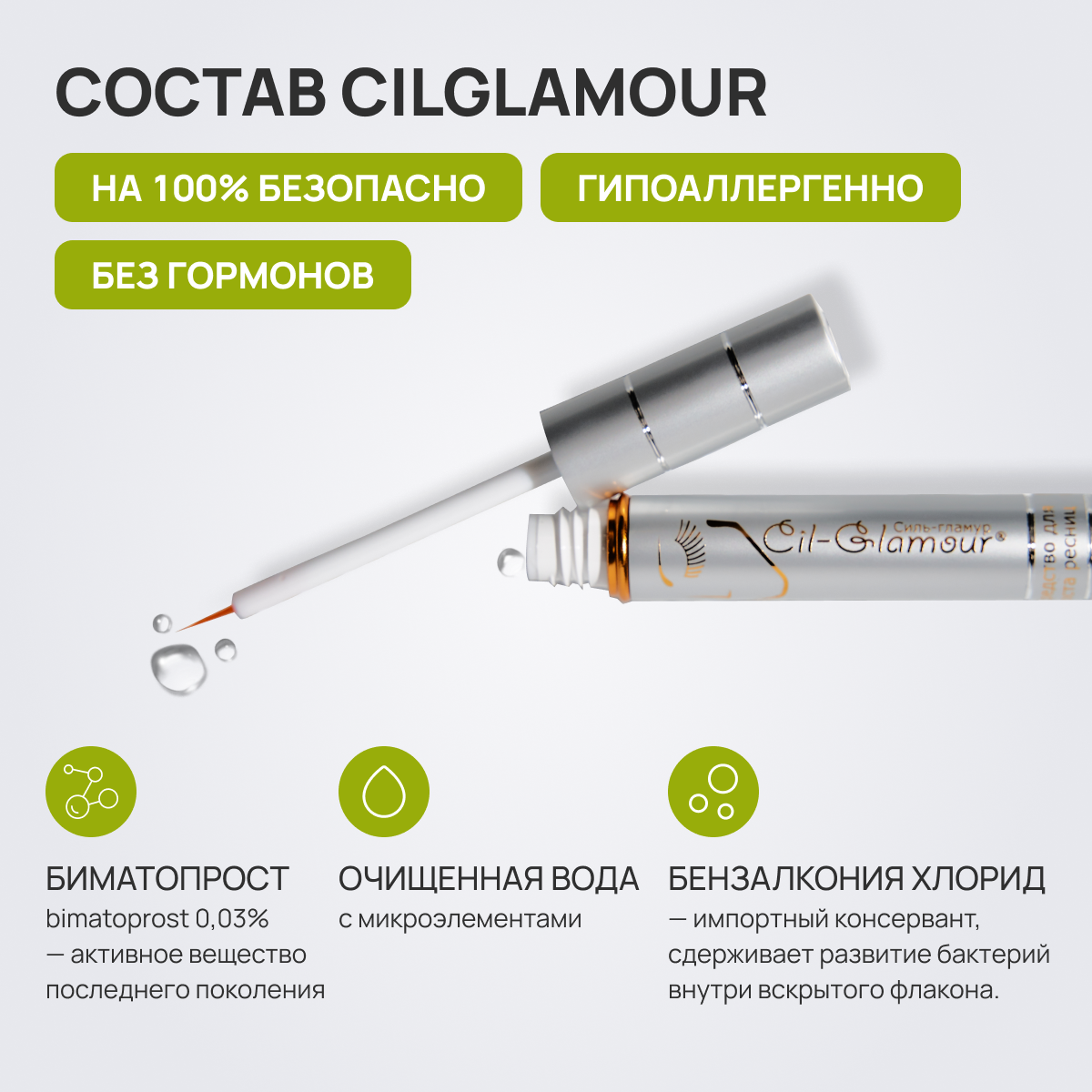 | Способ применения | 1) Тщательно очистите кожу вокруг глаз (демакияж). Если вы носите контактные линзы, снимите их перед нанесением. 2) Одним движением кисточки нанесите СильГламур на кожу верхнего века. Важно, чтобы средство ложилось точно вдоль линии роста ресниц, как подводка. 3) Подождите 15-20 минут до полного впитывания средства, прежде чем наносить косметику, ложиться спать или надевать линзы. |