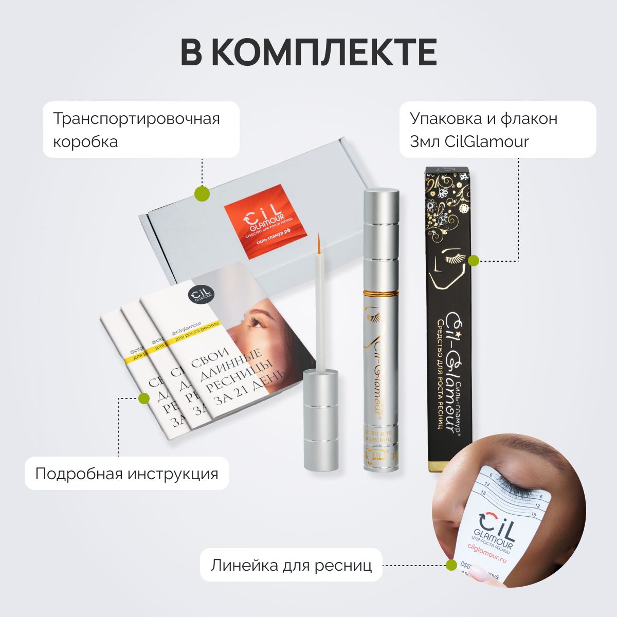 | Подробная комплектация | средство СильГламур в алюминиевом флаконе с кисточкой, подробная инструкция, линейка для ресниц |