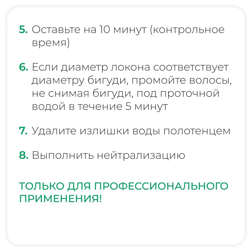 | Способ применения | вымыть волосы шампунем для глубокой очистки волос «Deep Cleansing», подсушить полотенцем; волосы накрутить на бигуди и тщательно пропитать лосьоном, если по истечению контрольного времени (10 мин) диаметр локона соответствует диаметру бигуди, промыть волосы, не снимая бигуди, под проточной водой в течение 5 мин; удалить излишки воды полотенцем; выполнить нейтрализацию |