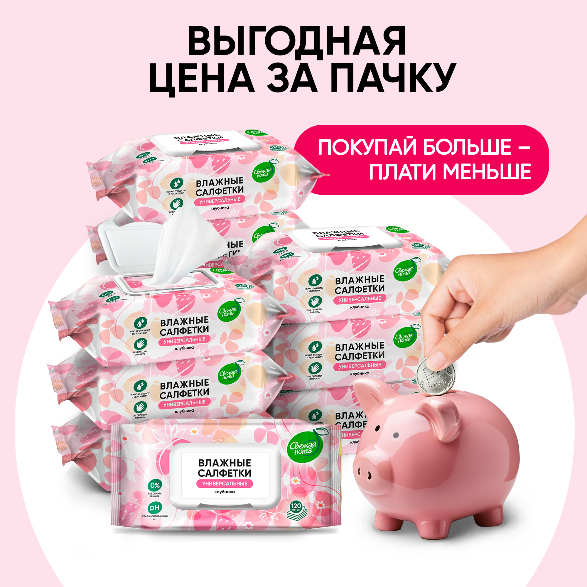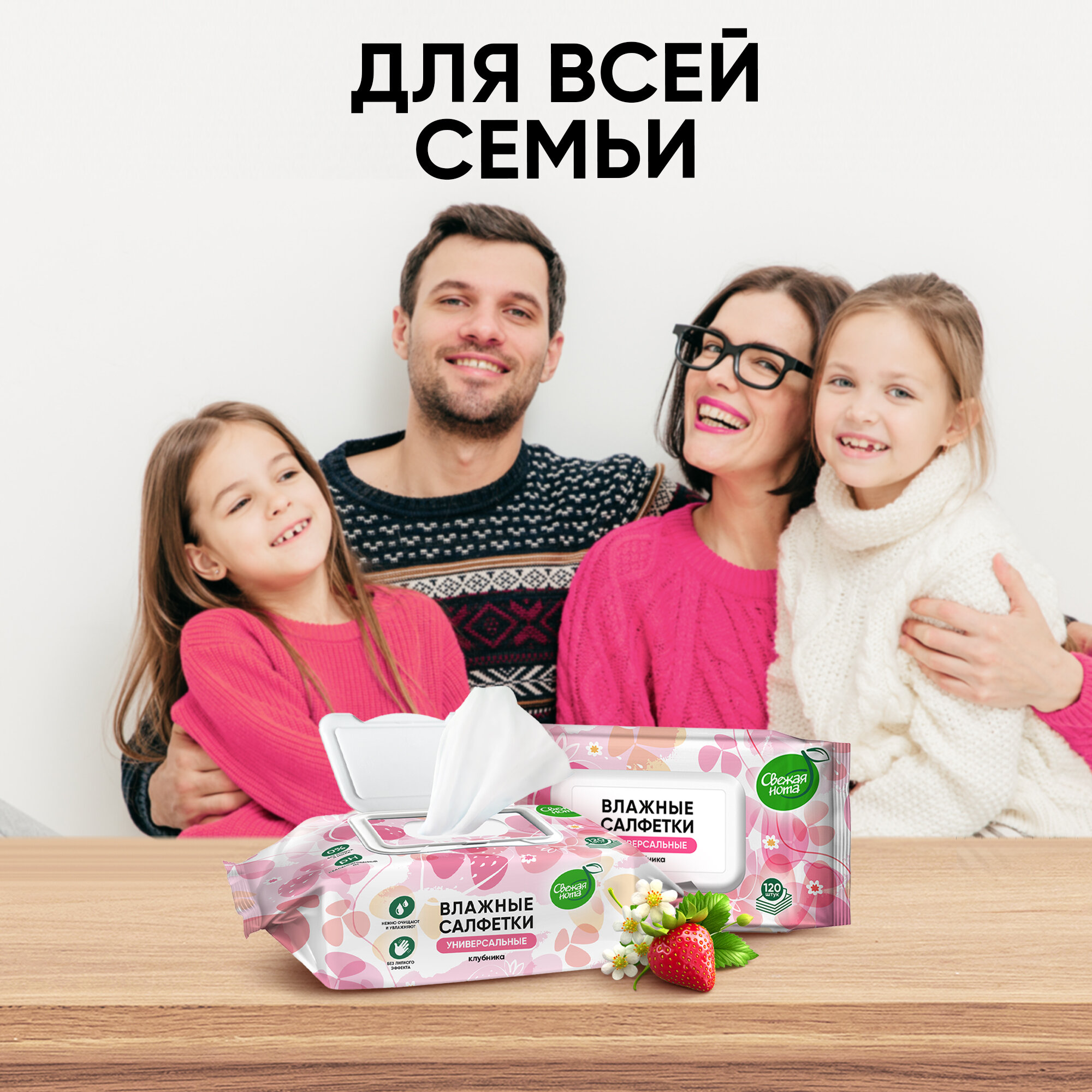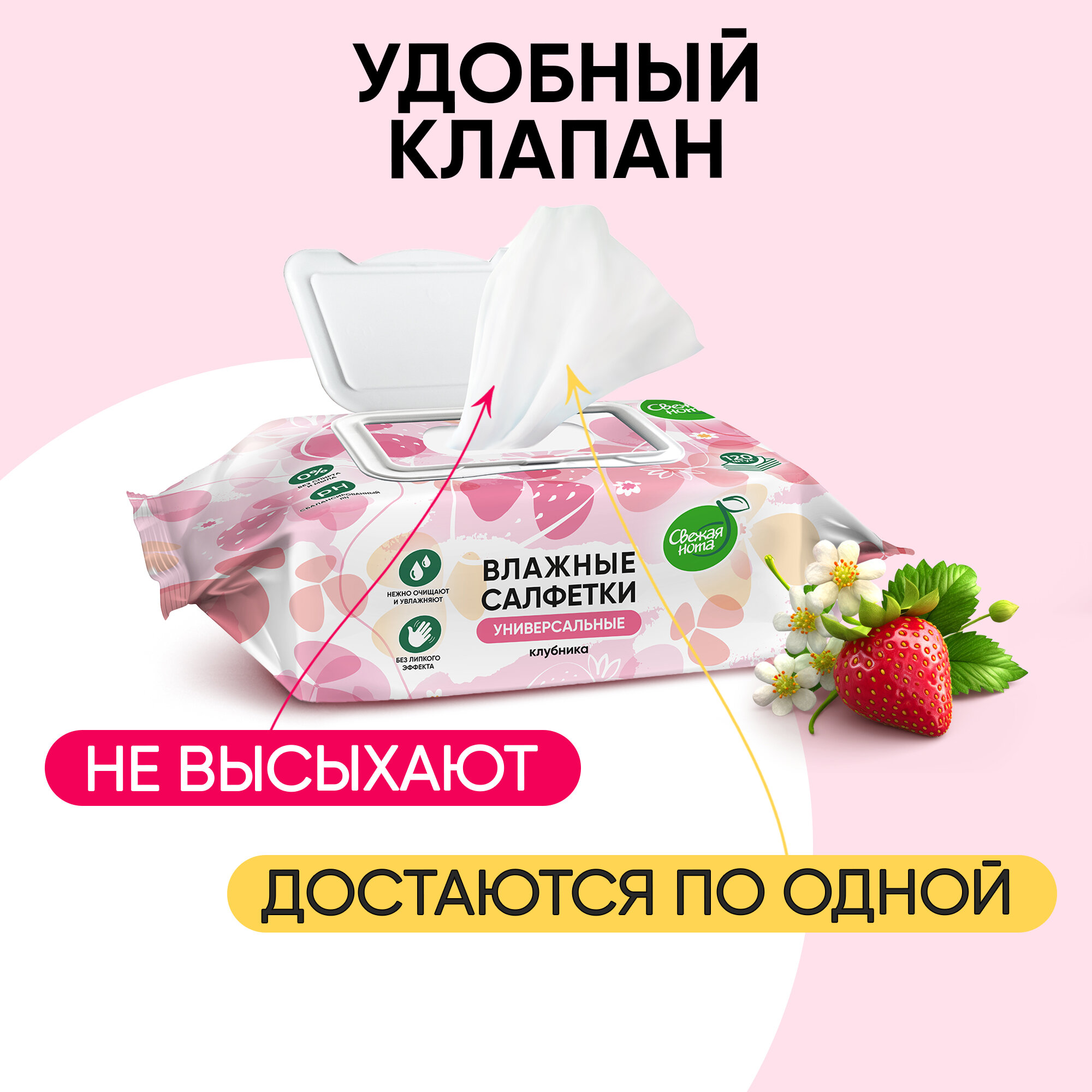 Свежая нота Влажные салфетки универсальные для всей семьи с ароматом Клубники с клапаном, 720 шт. (120х6)