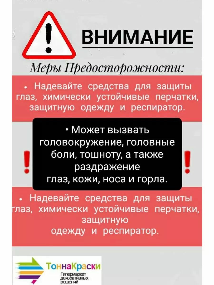 | Дополнительная информация | меры предосторожности: при попадании в глаза и на кожу – промыть большим количеством воды; для защиты рук – использовать перчатки; при проведении покрасочных работ рекомендуется проветривание помещений. Не использовать на поверхностях, контактирующих с питьевой водой и пищевыми продуктами. |