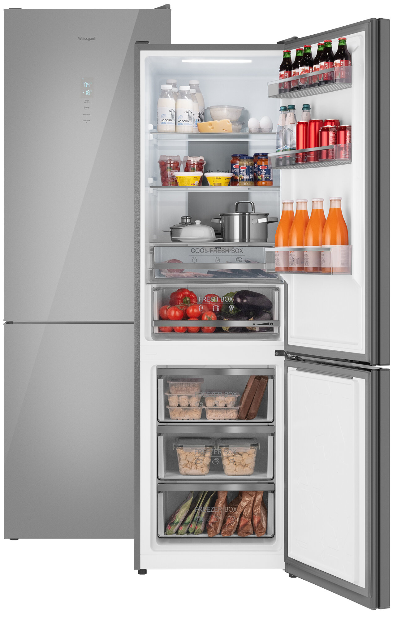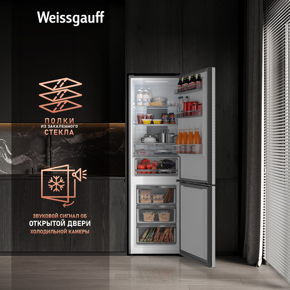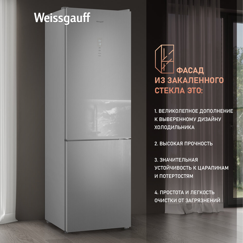 Холодильник Weissgauff WRK 195 D Full NoFrost Inox Glass двухкамерный Стеклянный фасад, 3 года гарантии, высота 195,3 см, ширина 60 см, Тихий режим, Большой объём, Сенсорное управление, Дисплей, Супер заморозка, Супер охлаждение, LED освещение