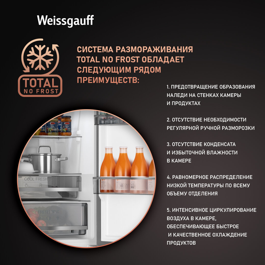 Холодильник Weissgauff WRK 195 D Full NoFrost Bru Steel Glass, Общий объем 378 литров, Двухкамерный, Стеклянный фасад