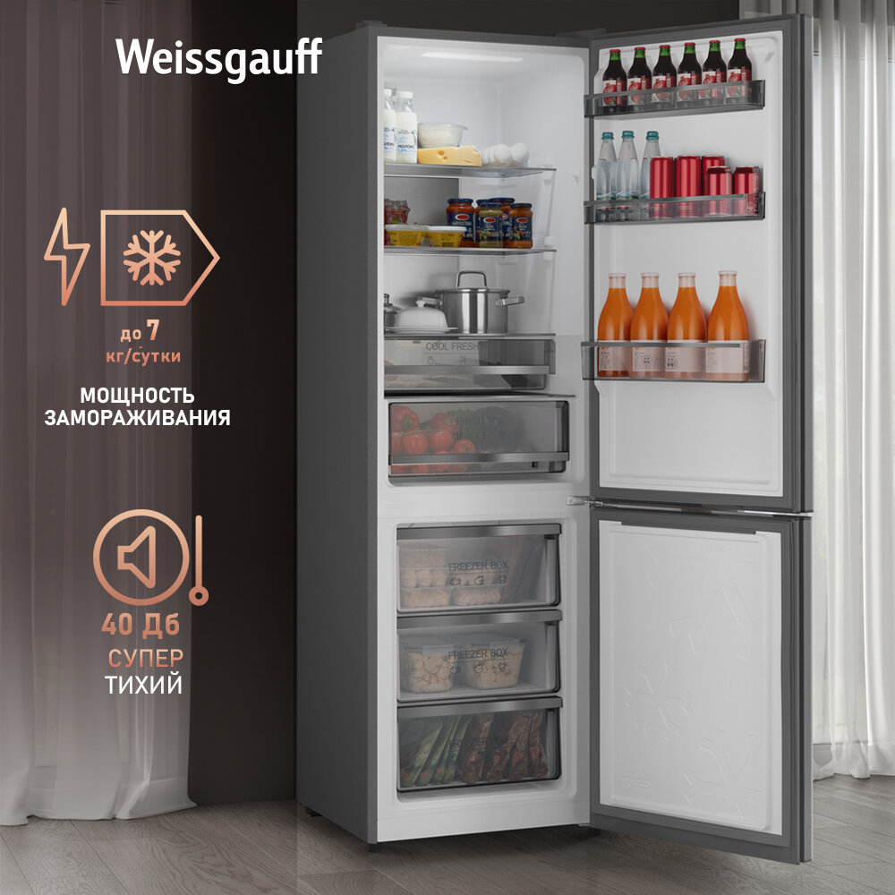Отдельностоящий холодильник Weissgauff WRK 195 D Full NoFrost Dark Grey Glass двухкамерный ширина 60 см, 3 года гарантии, Стеклянный фасад, Тихий режим, Большой объём, Сенсорное управление, Дисплей, Супер заморозка, Супер охлаждение, LED освещение