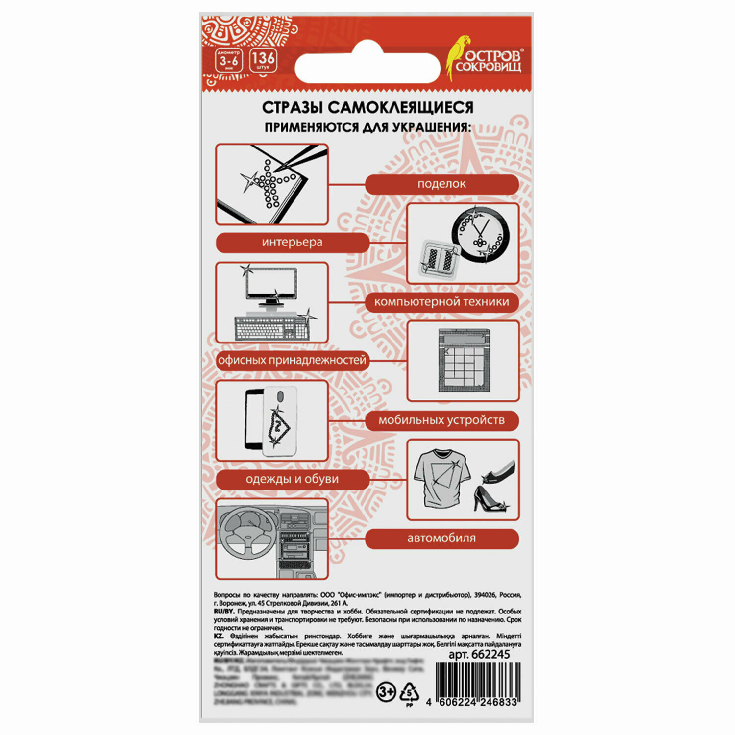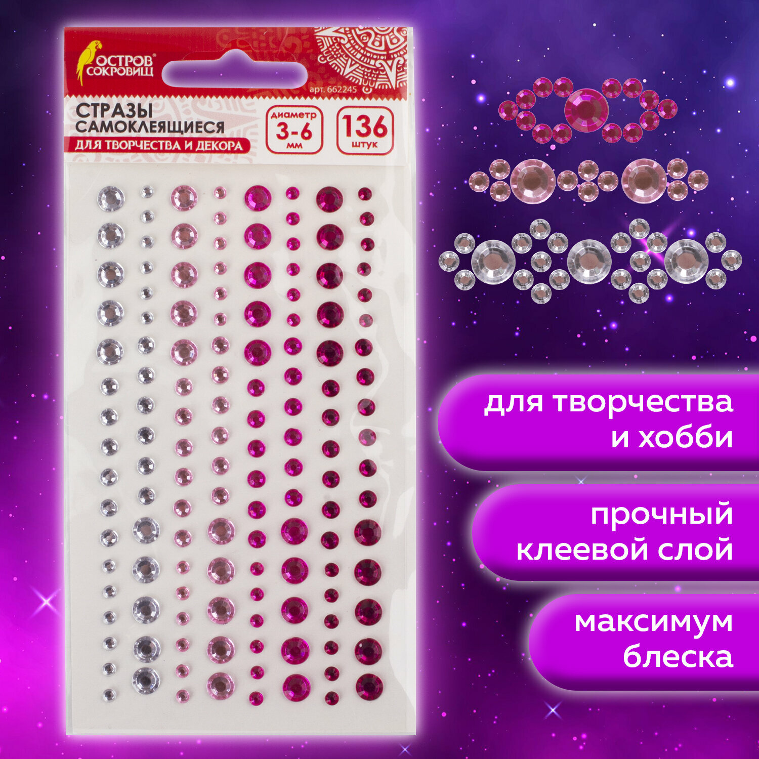 Стразы самоклеящиеся для творчества, рукоделия, аппликаций Круглые, 3-6 мм, 136 штук, перламутровые, Остров Сокровищ, 662245 интересное: