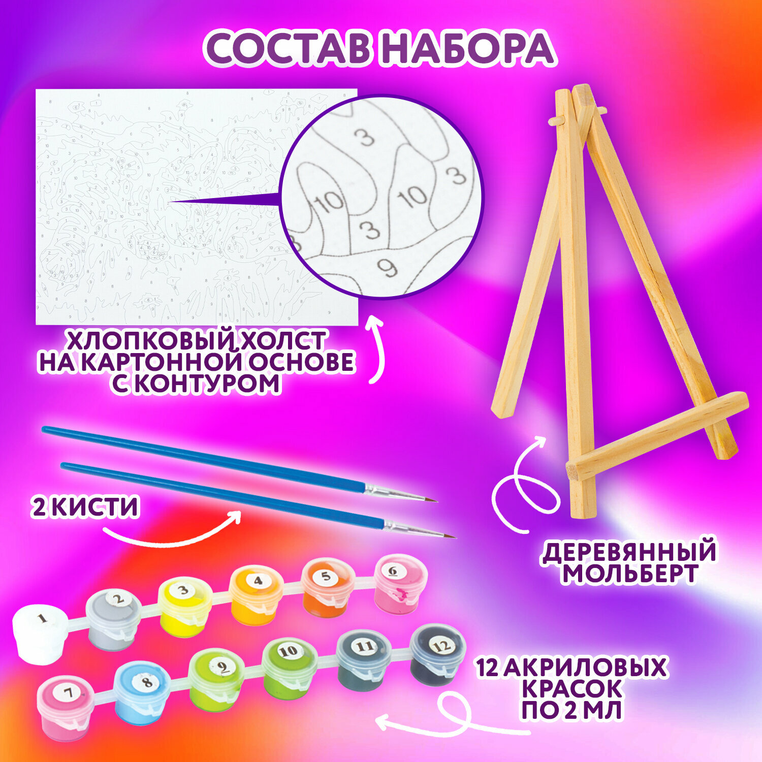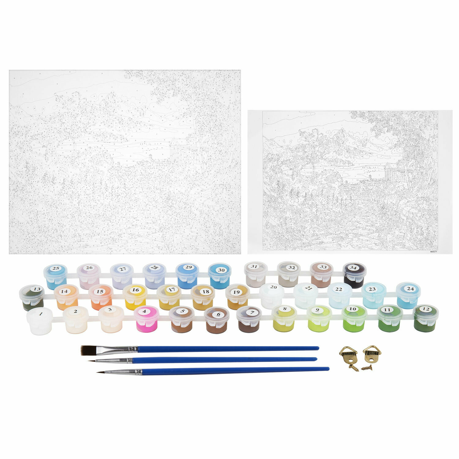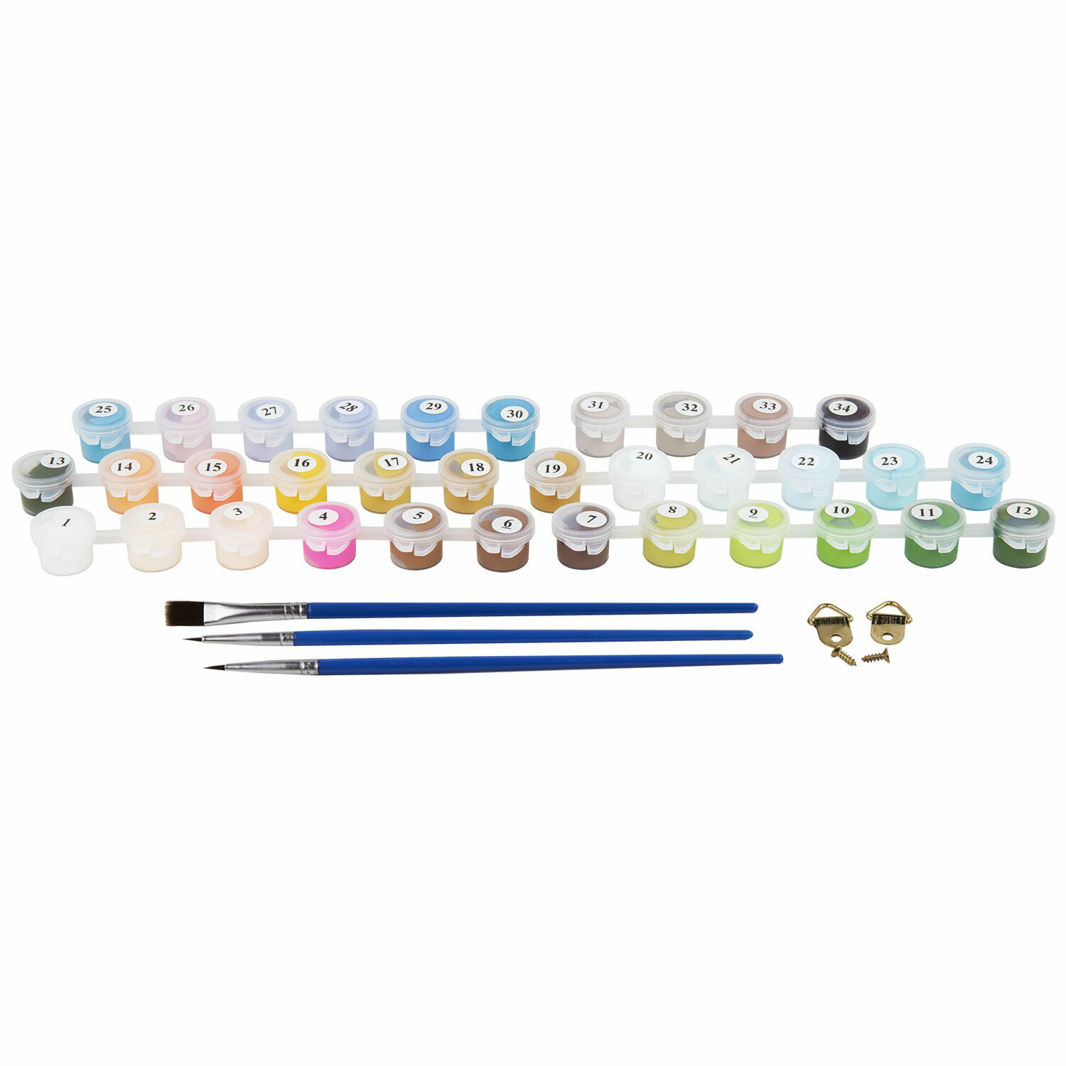 | Комплектация | 1 хлопковый холст на подрамнике с контуром, 1 лист бумаги для тренировки, 26 акриловых красок объемом 3 мл каждая, 3 синтетические кисти и комплект металлических креплений для подвешивания на стену |