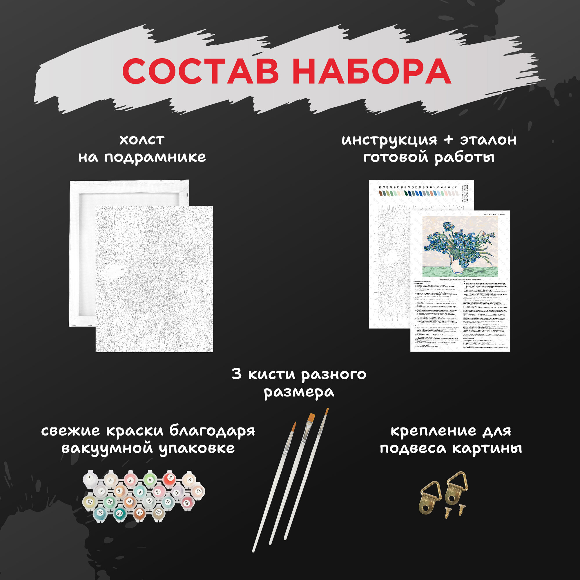 | Особенности | кисти в комплекте / краски в комплекте / репродукция картины |