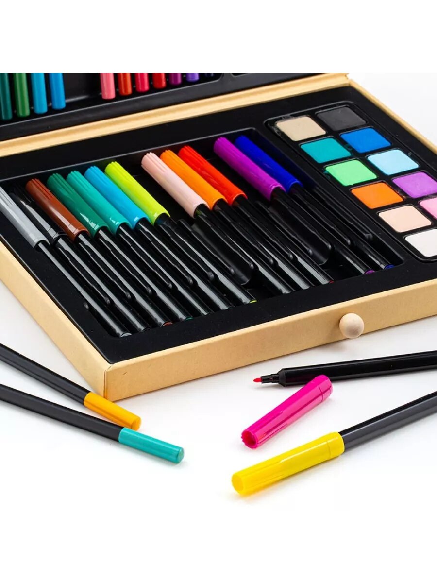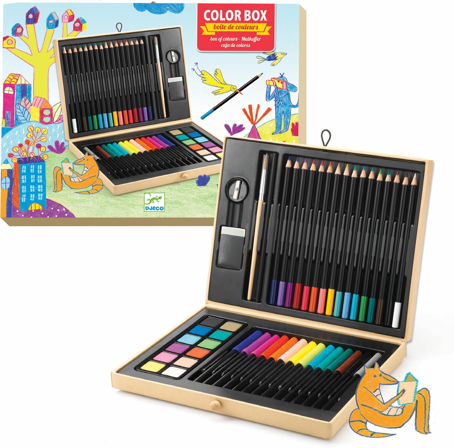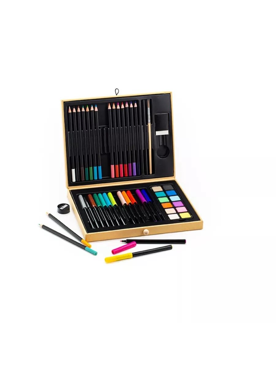 Набор для рисования Djeco, карандаши, фломастеры, акварель, деревянная коробка, 47 предметов, 21х26х4 см, для подарка