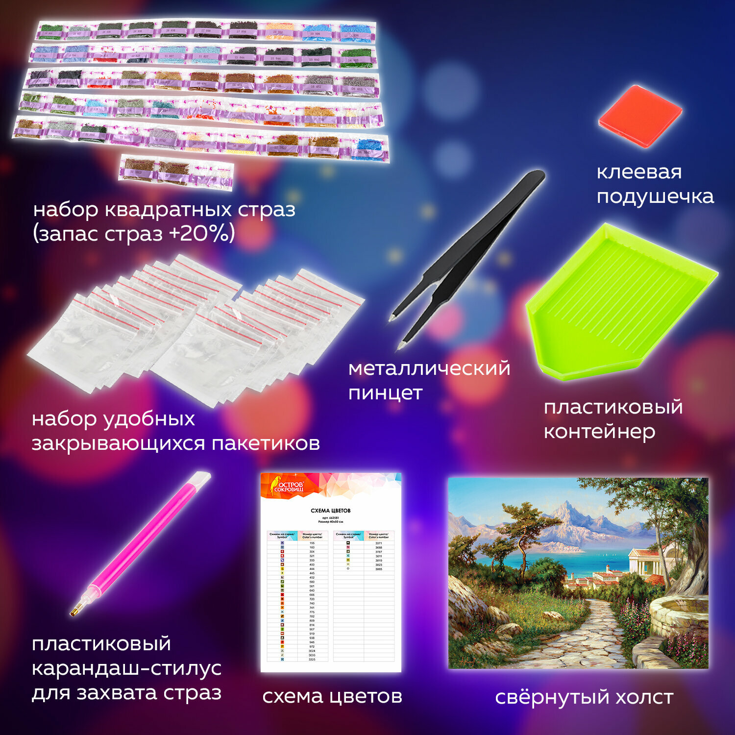 | Особенности | лоток для страз / пинцет / подрамник / стилус / холст |