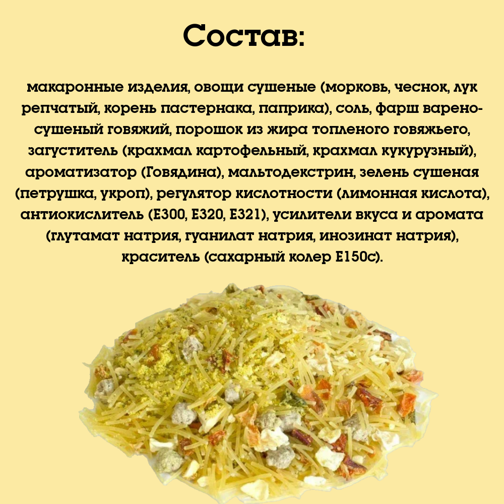 | Состав | макаронные изделия, овощи сушеные (морковь, чеснок, лук репчатый, корень пастернака, паприка), соль, фарш варено-сушеный говяжий, порошок из жира топленого говяжьего, загуститель (крахмал картофельный, крахмал кукурузный), ароматизатор (Говядина), мальтодекстрин, зелень сушеная (петрушка, укроп), регулятор кислотности (лимонная кислота), антиокислитель (Е300, Е320, Е321), усилители вкуса и аромата (глутамат натрия, гуанилат натрия, инозинат натрия), краситель (сахарный колер Е150с). |