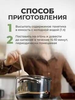| Способ приготовления | Для приготовления необходимо развести содержимое пакетика 4 стаканами воды (1000 мл). Поставить на огонь и довести до кипения. Варить на медленном огне в течении 10-15 минут / переодически помешивая. Так же по желанию можно добавлять что-то дополнительно / в зависимости от вкусовых предпочтений |