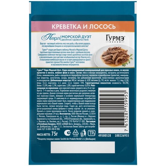 GOURMET PERLE Дуэт пауч для кошек Креветка и Лосось 75гр (Упаковка 26шт)