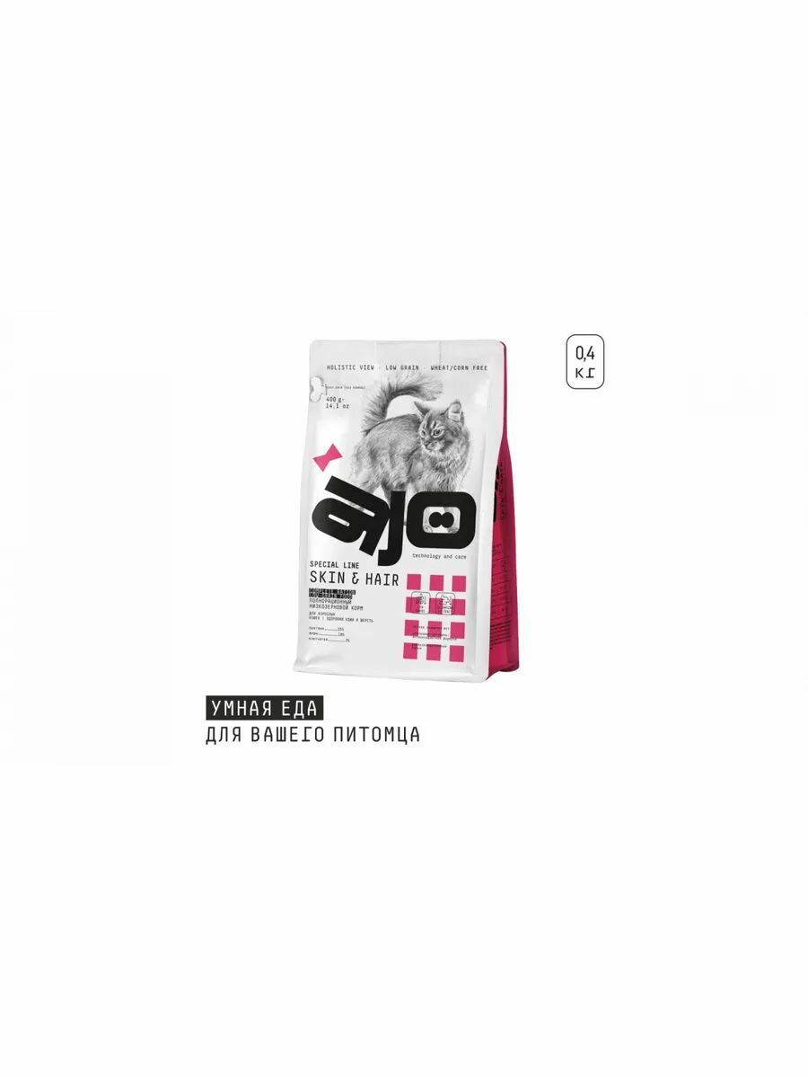 AJO Cat Skin & Hair Сухой полнорационный корм для кошек здоровая кожа и красивая шерсть 400г