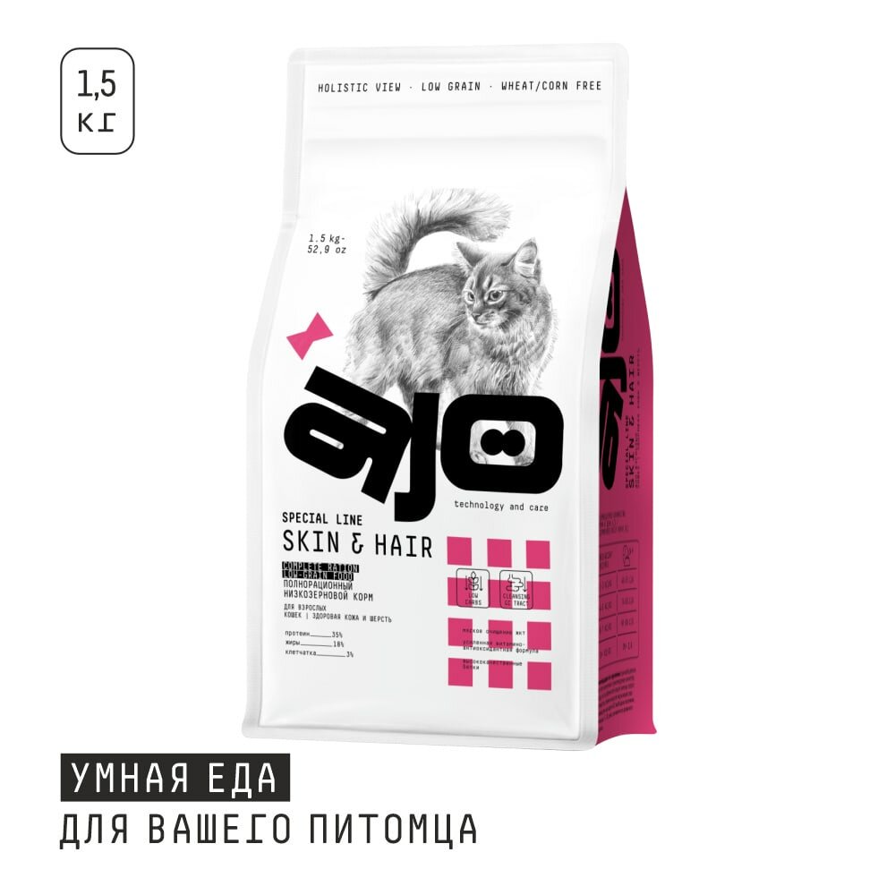 Сухой корм AJO Cat Skin & Hair для кошек, здоровая кожа и красивая шерсть 1.5 кг