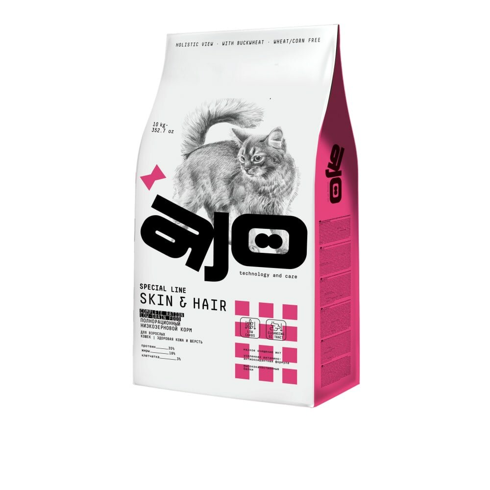 Сухой низкозерновой корм для взрослых кошек AJO Skin & Hair Здоровая кожа и красивая шерсть, 10 кг
