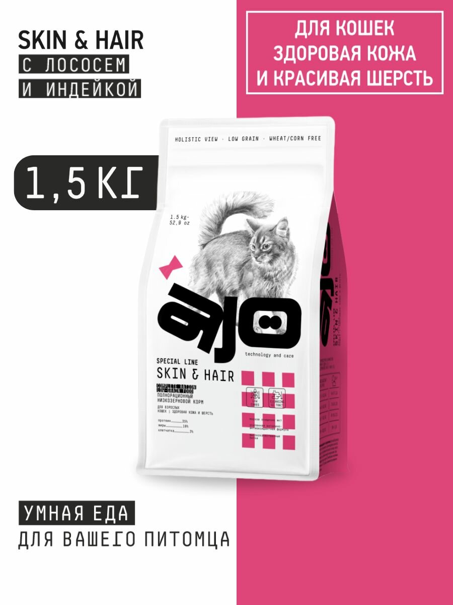 AJO Skin & Hair полнорационный корм для кошек здоровая кожа и красивая шерсть Индейка и лосось, 1,5 кг.