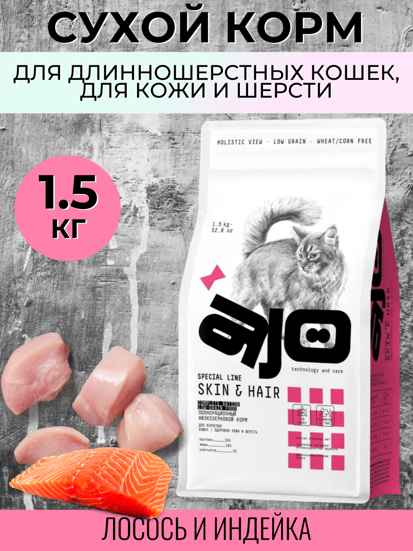 Купить Сухой корм AJO Cat Skin & Hair для кошек, здоровая кожа и красивая шерсть, с лососем и индейкой, 1,5 кг