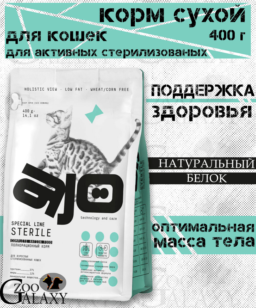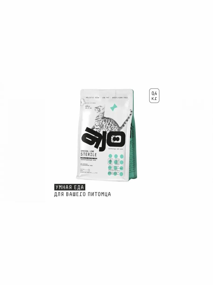 Корм для кошек сухой AJO / Айо Cat Sterile для взрослых стерилизованных животных, гранулы 400г / кошачья еда для ежедневного кормления