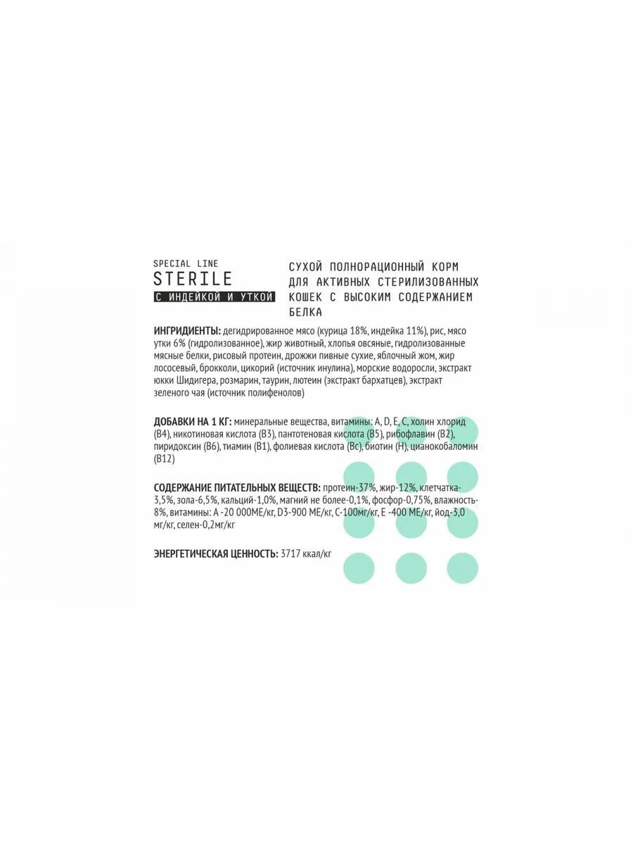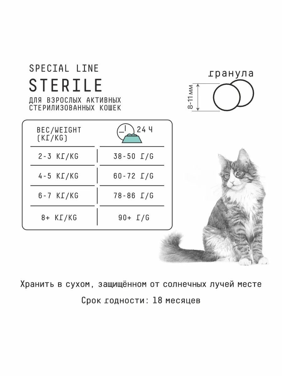 | Особые потребности | беззерновой / гипоаллергенный / для беременных / кормящих кошек / для вывода шерсти / для живущих в помещении / для живущих на улице / для здоровья кожи и блеска шерсти / для здоровья костей и суставов / для профилактики стресса / для снижения запаха стула / для стерилизованных/кастрированных / при диабете / при чувствительном пищеварении / профилактика МКБ / профилактика зубного камня / профилактика избыточного веса |