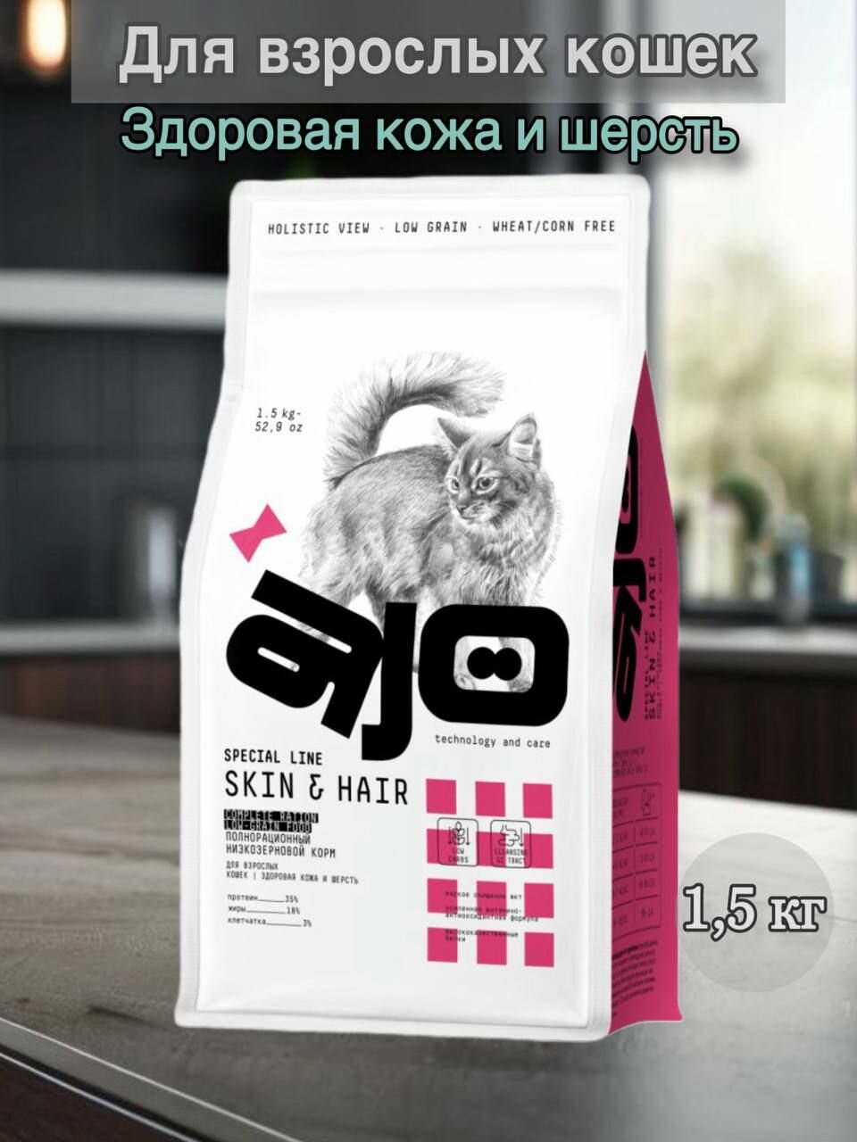 Сухой корм AJO Cat Skin & Hair для кошек, здоровая кожа и красивая шерсть 1.5 кг