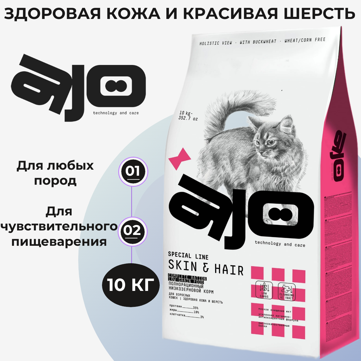 Сухой низкозерновой корм для взрослых кошек AJO Skin & Hair Здоровая кожа и красивая шерсть, 10 кг