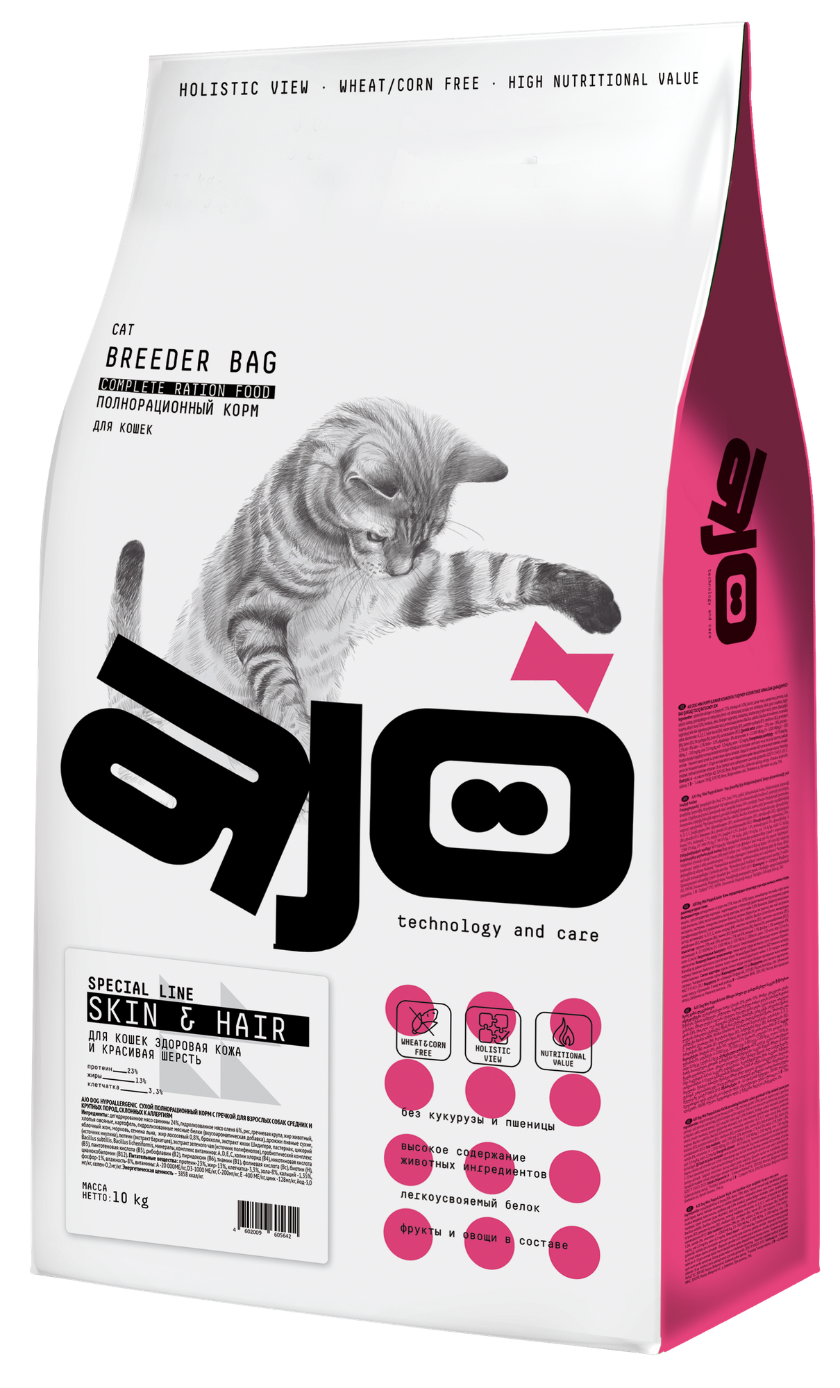 Сухой корм AJO Cat Skin & Hair для кошек, здоровая кожа и красивая шерсть, с лососем и индейкой, 10 кг