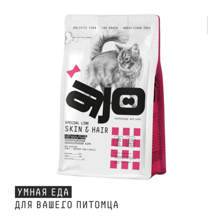 Сухой низкозерновой корм для взрослых кошек AJO Skin & Hair Здоровая кожа и красивая шерсть, 1,5 кг