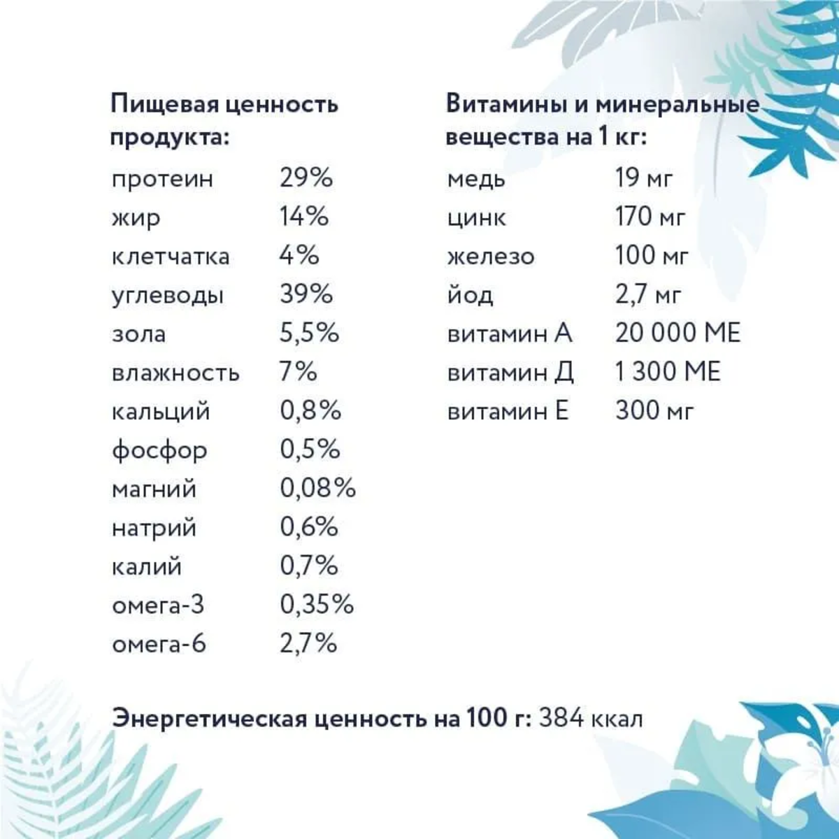 | Минеральные вещества | кальций 0,7%, фосфор 0,6%, магний 0,055%, натрий 0,6%, калий 0,6%, медь 18 мг/кг, цинк 160 мг/кг, железо 100 мг/кг, йод 1,5 мг/кг |