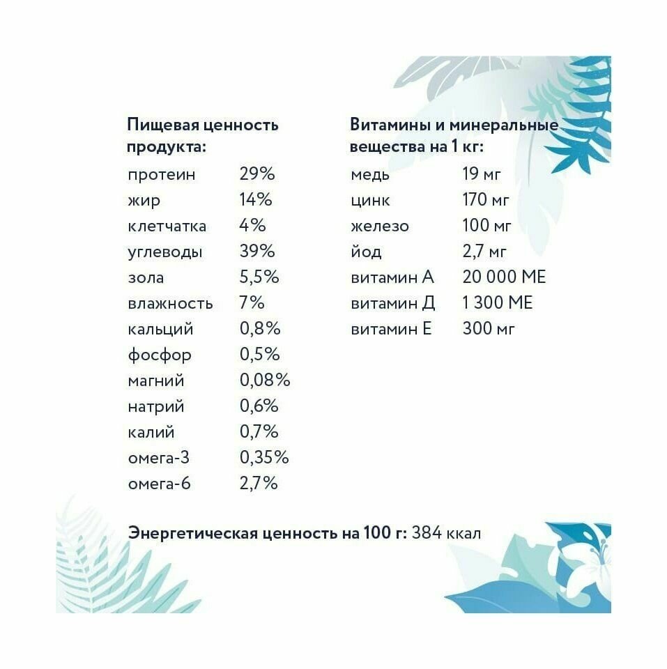 | Пищевая ценность | на 100 г продукта: белок 29 г, жир 15 г, углеводы 41 г |